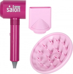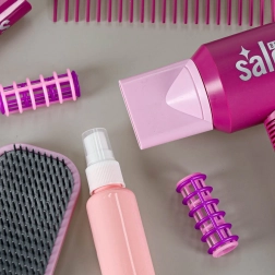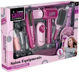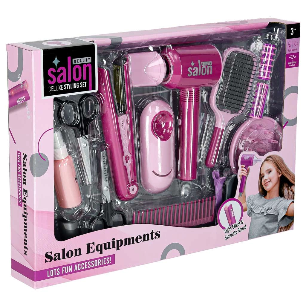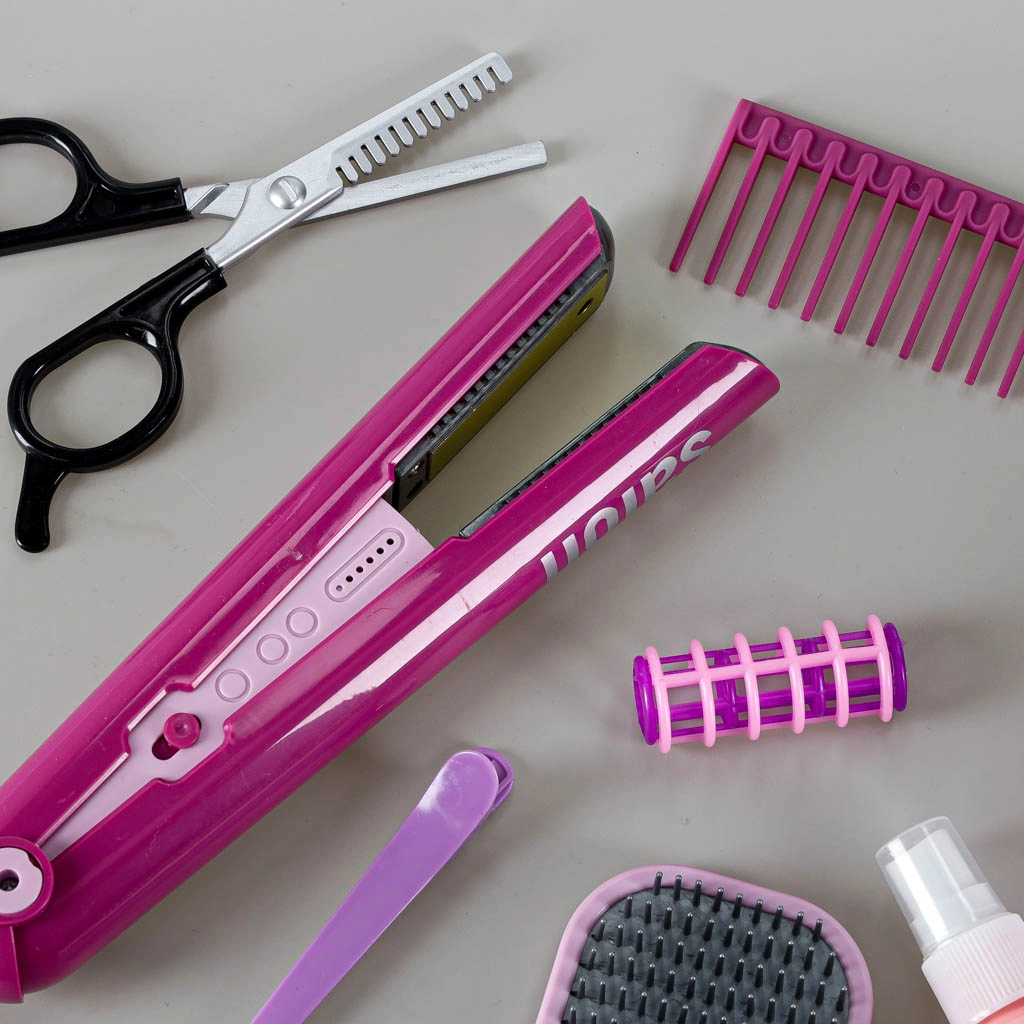 U pakiranju je sve za potpunu preobrazbu: fen s dva nastavka (koncentrator i difuzor), dječja pegla s postoljem, četka i češalj, 2 vrste škara bez oštrih rubova, vikleri i šnalice te prazna bočica za “styling”. Cijeli set je lagan, izdržljiv i siguran za djecu od 3 godine naviše.