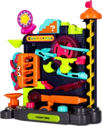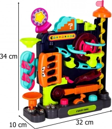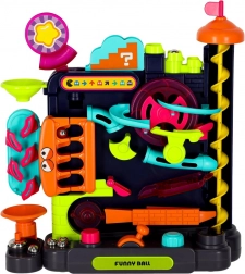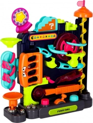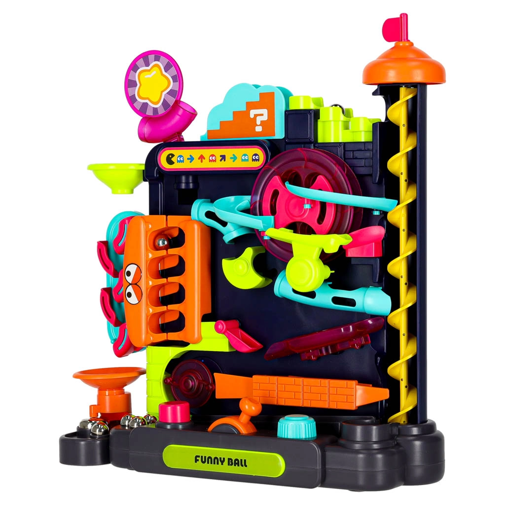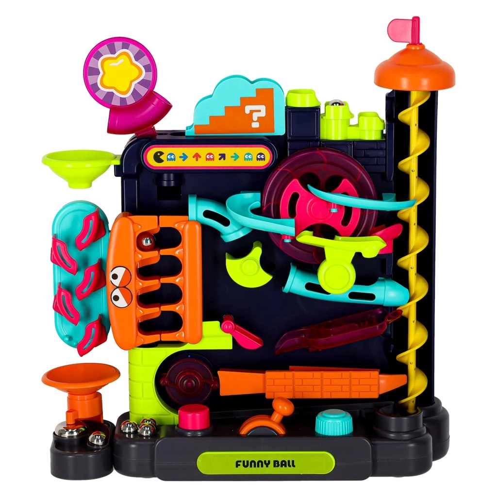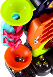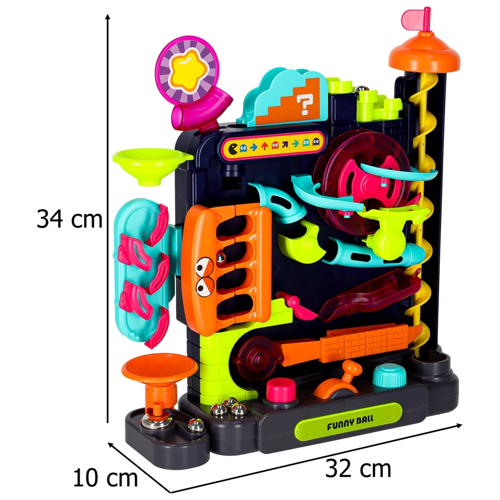 Otkrijte zabavnu kugličnu stazu koja razvija finu motoriku, koordinaciju ruka–oko i uči principu uzrok–posljedica. Pomoću polugica, kotačića i tipki usmjeravate metalne kuglice po trasi punoj rampi, lijevaka i rotirajućih elemenata. Šareno izvedenje i izdržljiva konstrukcija osiguravaju dinamičnu igru i dugi vijek trajanja.