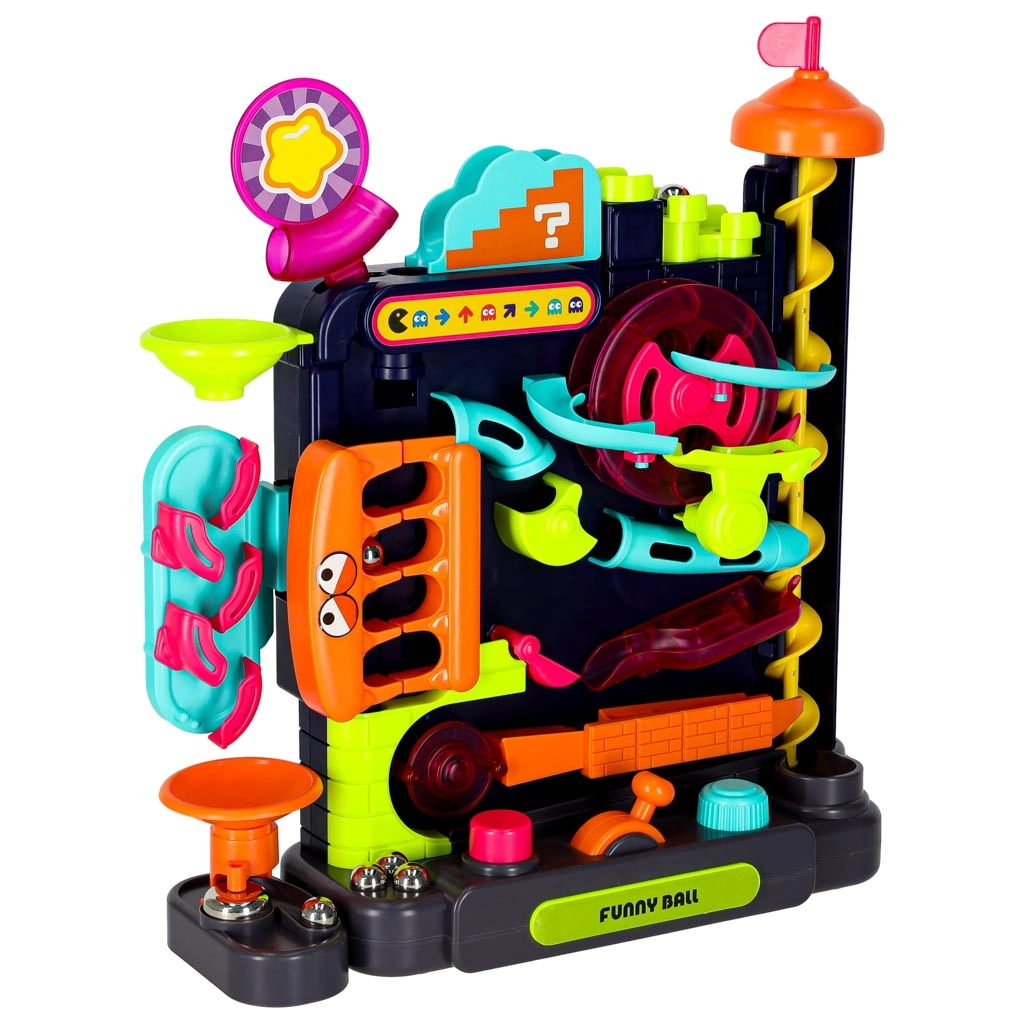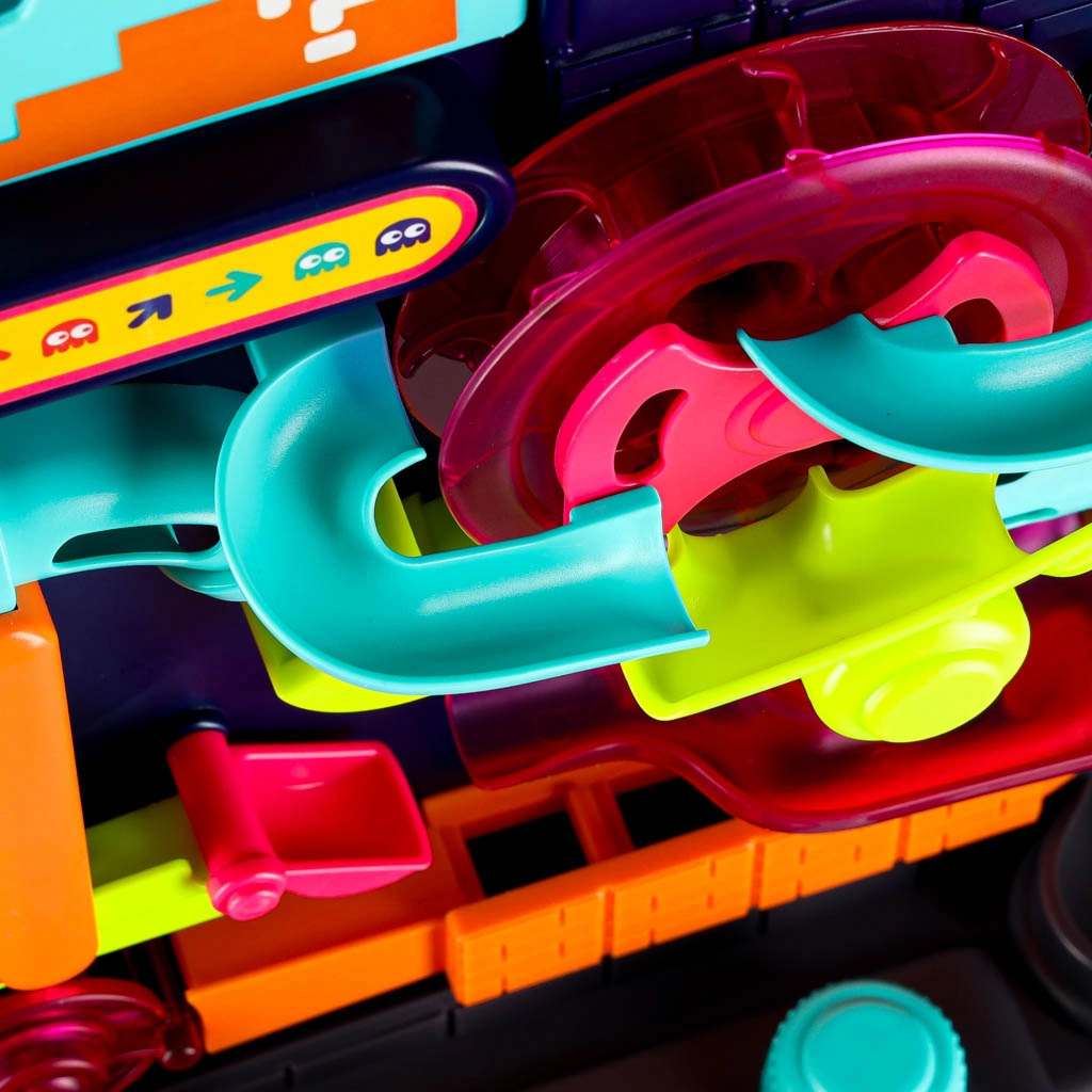 Zahvaljujući robusnoj plastičnoj konstrukciji, stabilnoj bazi i preglednom rasporedu trasa, igra je pristupačna i mlađoj djeci. U kompletu se nalazi set 6 metalnih kuglica koje se lako pokreću i ponovno vraćaju na start. Mnoštvo puteva i pokretnih dijelova potiče kreativnost, logičko razmišljanje i koncentraciju.