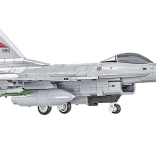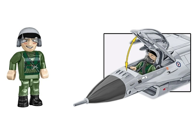 Sastavni dijelovi su AIM‑120 AMRAAM, IRIS‑T, GBU‑12 Paveway II i spremnik ALQ‑131 ECM. Otvarajući pokrov kabine i figurica pilota za akcijske scenarije.