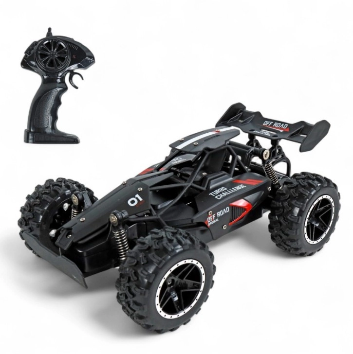 Brzi terenski RC automobil s frekvencijom 2,4 GHz, brzinom do 15 km/h i neovisnim ovjesom kotača. Izdržljiva konstrukcija s gumiranim gumama savladava vožnju u zatvorenom i na otvorenom. U paketu su USB punjač, akumulator 3,7 V i baterije za upravljač – dovoljno je raspakirati i krenuti.