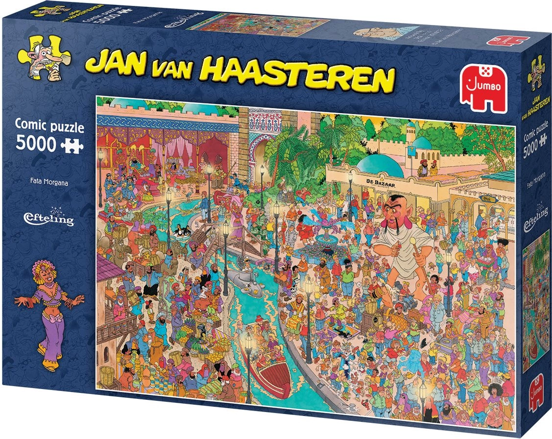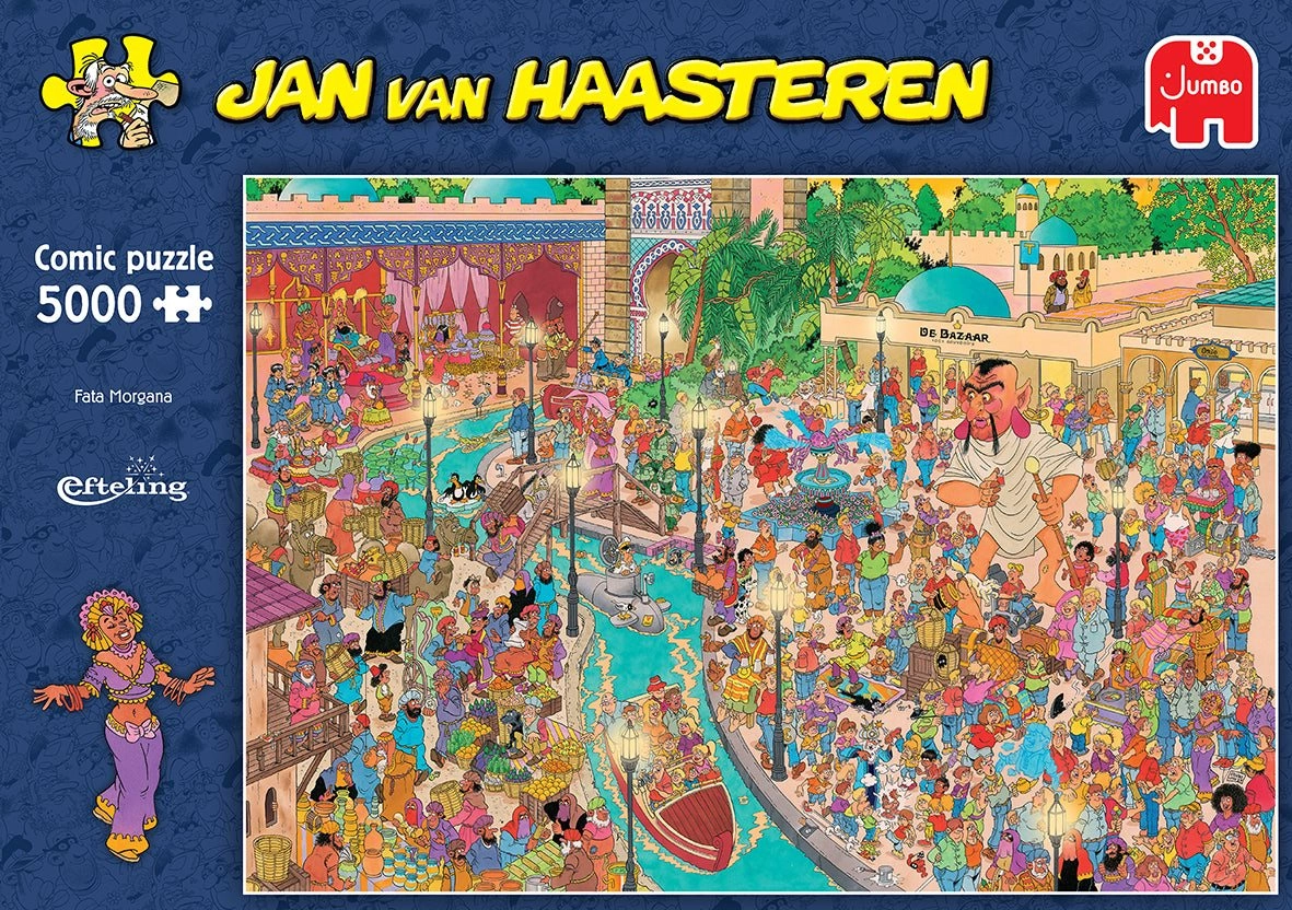 Uronite u šareni kaos i razigrani svijet ilustratora Jana van Haasterena. Ove velike puzzle s motivom Fata Morgane u zabavnom parku Efteling savršen su izbor za ljubitelje izazova i kolekcionare. Svaki centimetar ilustracije skriva mnoštvo gegova i poznatih autorovih “potpisa” – od peraje morskog psa, preko Svetog Nikole, do autorova vlastitog portreta.