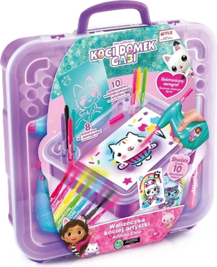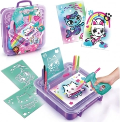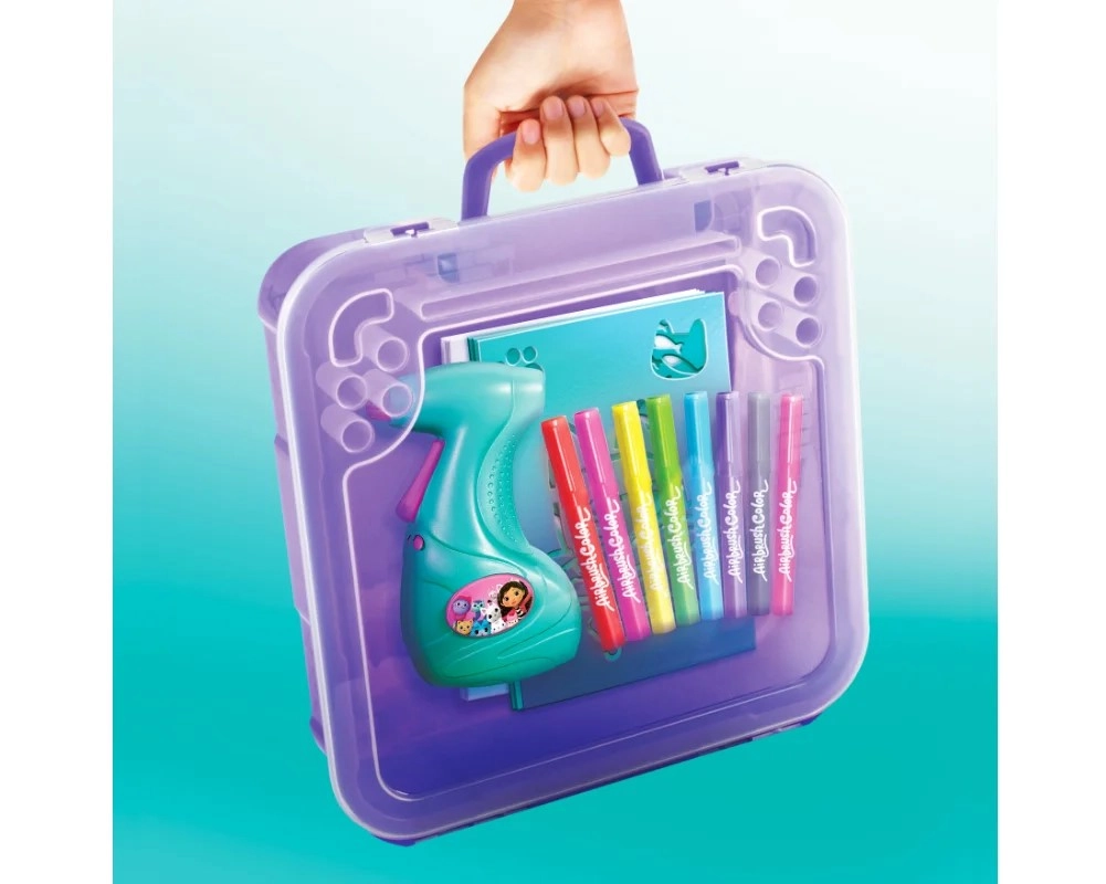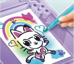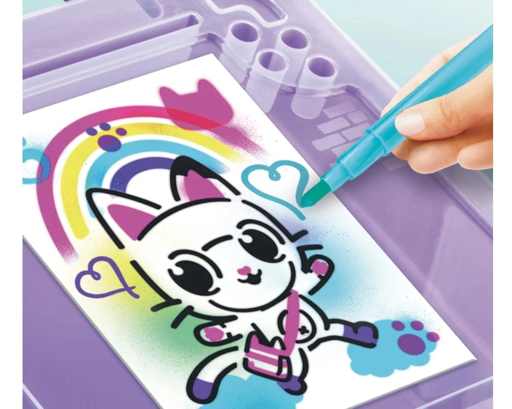 Ovaj prijenosni kreativni set izvrstan je dar za male umjetnike koji vole boje i maštu. Dovoljno je umetnuti flomaster u uređaj, pritisnuti gumb i početi špricati – jednostavno upravljanje savladat će i mlađa djeca. Dizajn nadahnut pričom Gabin mačji dom razveselit će sve obožavatelje slatkih mačjih likova.