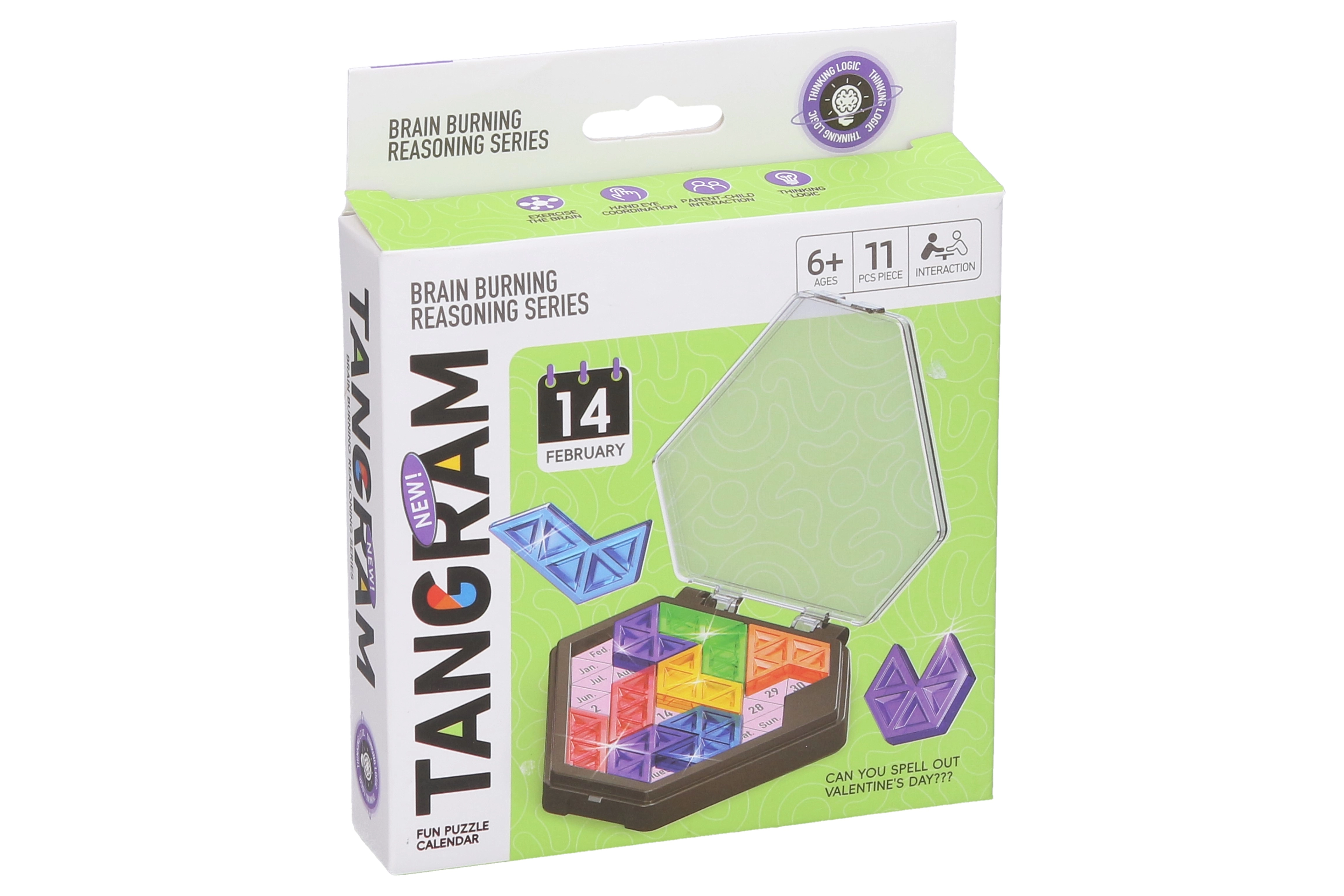 Otkrijte pametan i zabavan način za vježbanje logike i mašte s ovom tangram zagonetkom promjera 10 cm. U kompletu su šablone za slaganje raznih likova i konkretnih datuma (Majčin dan, Valentinovo i dr.), gdje je cilj složiti dijelove tako da bude vidljiv samo određeni datum i dan u tjednu. Dostupno u 2 varijante – crna i bijela.