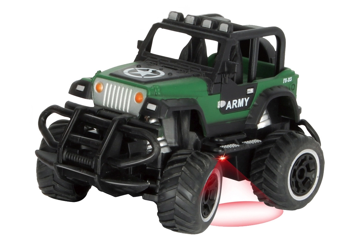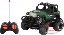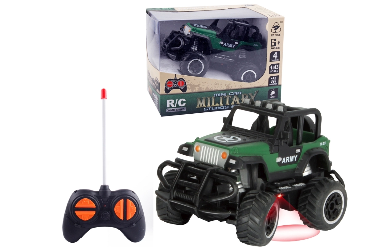 Kompaktno terensko vojno RC vozilo u mjerilu 1:43 razveselit će svakog malog vozača. Nudi jednostavno upravljanje, izdržljivu konstrukciju i zabavu u kući i na otvorenom. Napajanje na 4× AA baterije (nisu uključene u pakiranje). Pogodno za djecu od 6 godina.