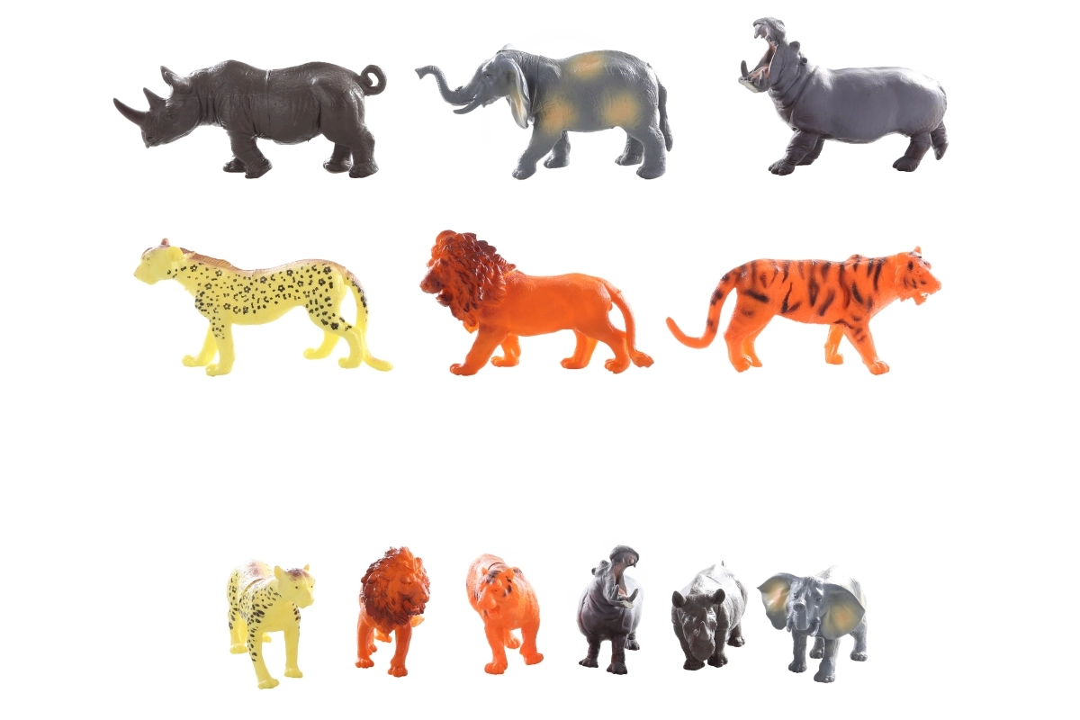 U pakiranju se nalazi 12 komada – po 2x nilski konj, nosorog, slon, tigar, lav i gepard. Figurice su prikladne za kreativnu igru, školske projekte i tematske dekoracije.