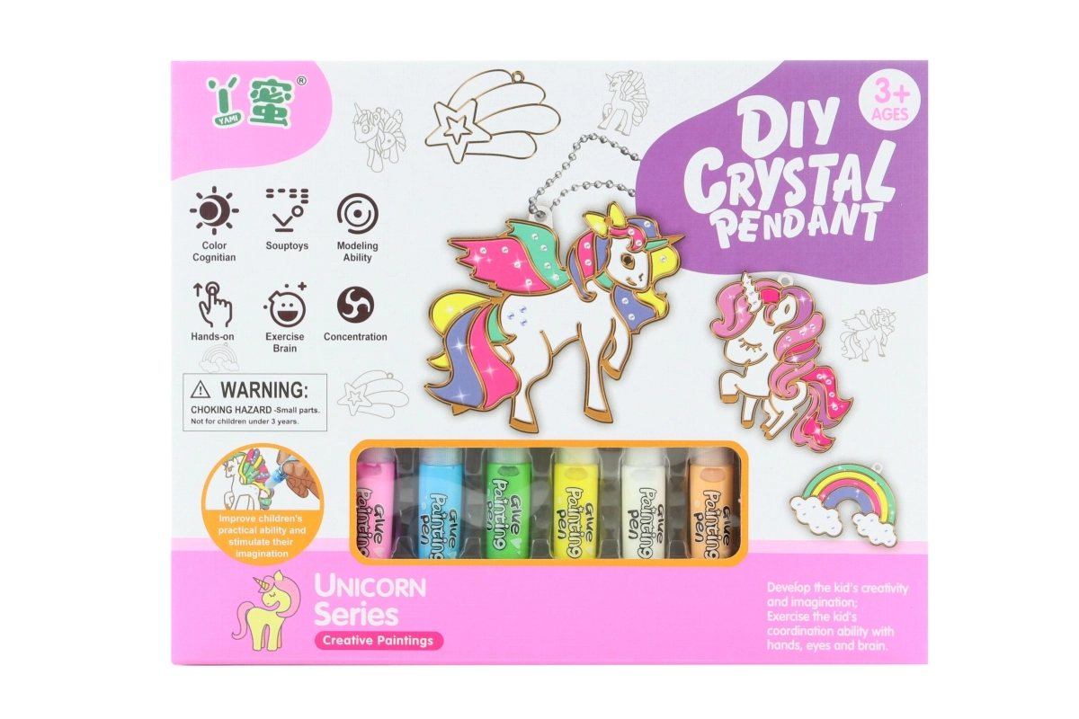 Otkrijte zabavni kreativni set za djecu s kojim mogu lako izraditi vlastite privjeske s motivom jednoroga. Pakiranje nudi sve potrebno – 6 privjesaka za ukrašavanje, 6 boja, šljokice, pincetu i uzice. Idealno za razvoj kreativnosti i fine motorike, pogodno za djecu od 3 godine.