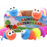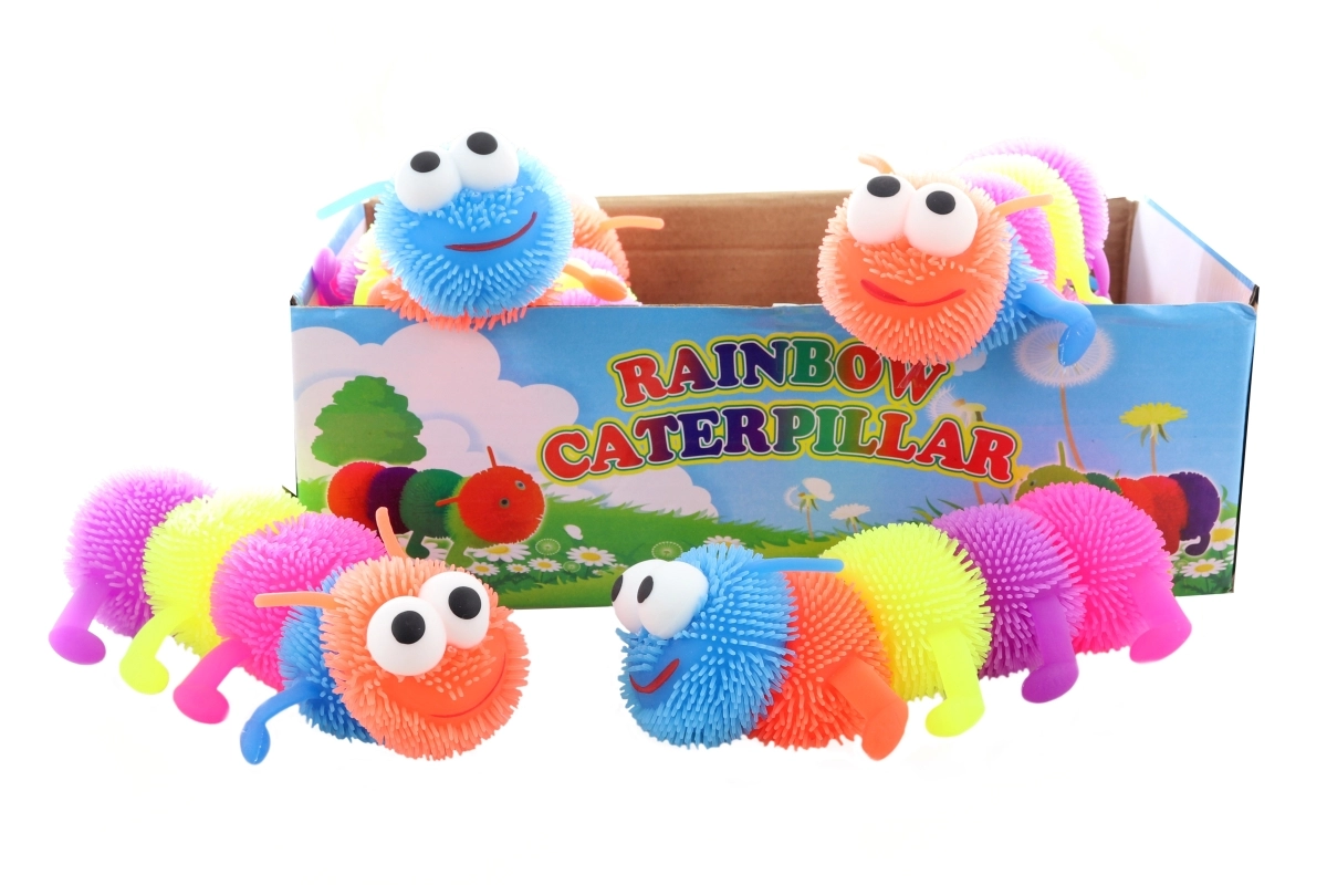 Zabavna gumena gusenica sa svjetlosnim efektom za djecu od 3 godine. Na dodir ili udarac bljeska svjetliljka u prednjem dijelu. Mekana, čupava površina potiče osjetilno opažanje i finu motoriku. Veličina cca 16,5 cm, idealna za male dječje ručice.