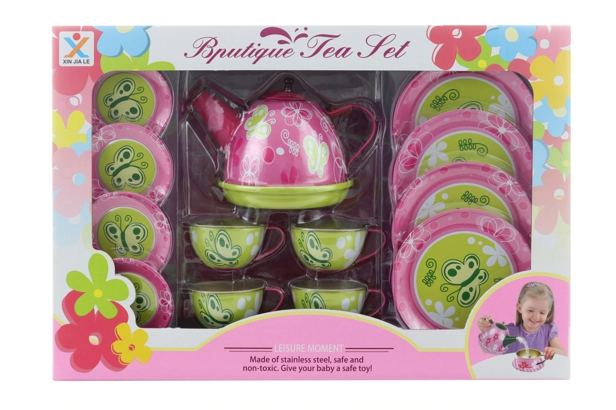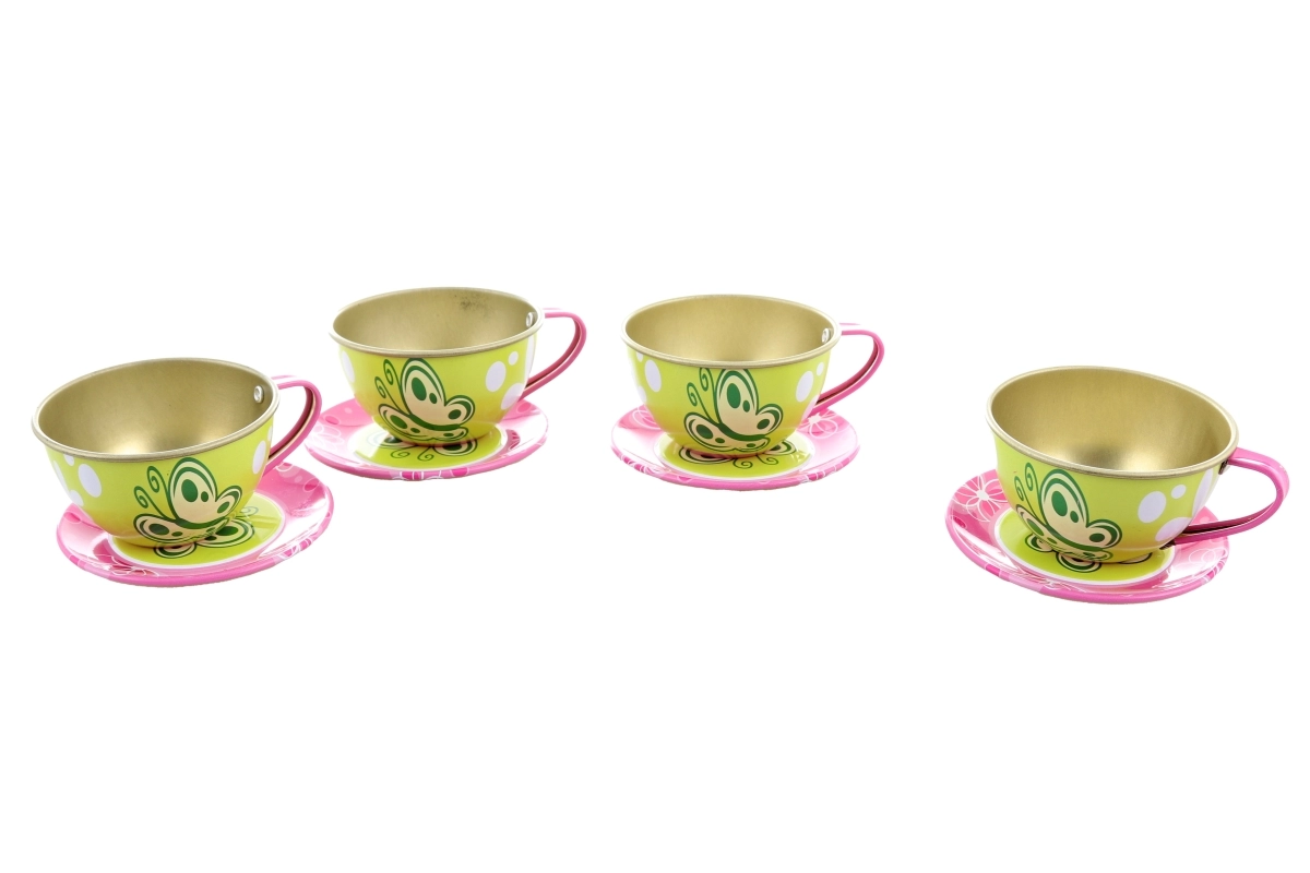 Čarobni limeni čajni set s motivom leptira razveselit će svaku malu domaćicu. Sadrži kannicu, 4 šalice, 4 tanjurića i 4 tanjura za igru čajanke. Idealno kao poklon za djecu od 3 godine.