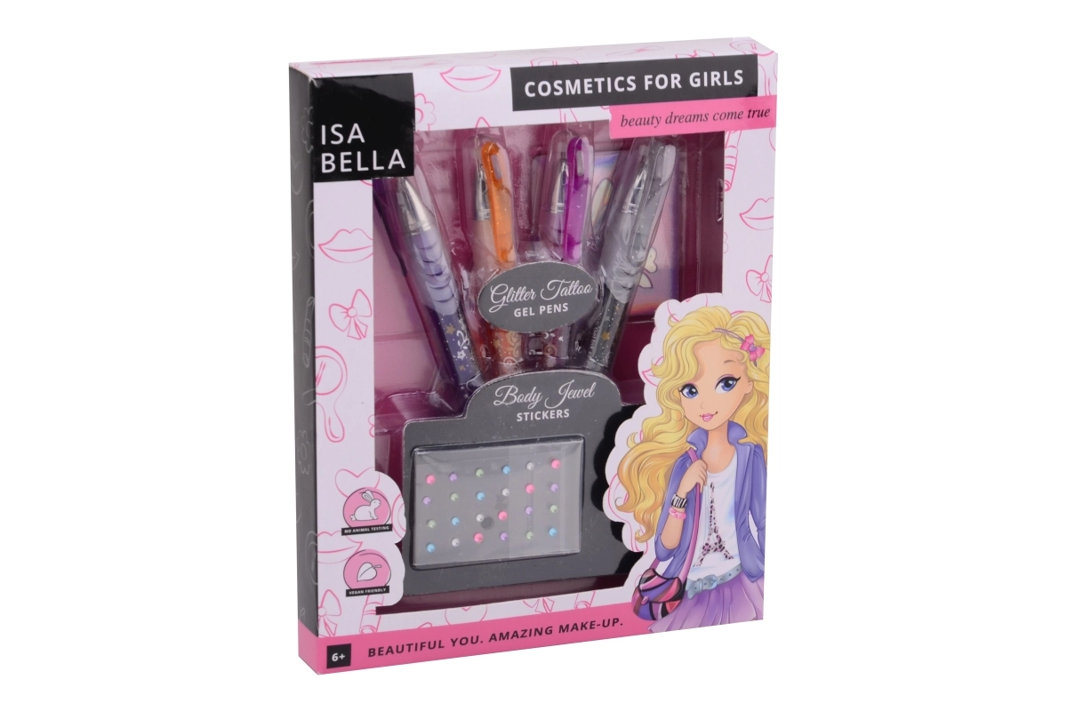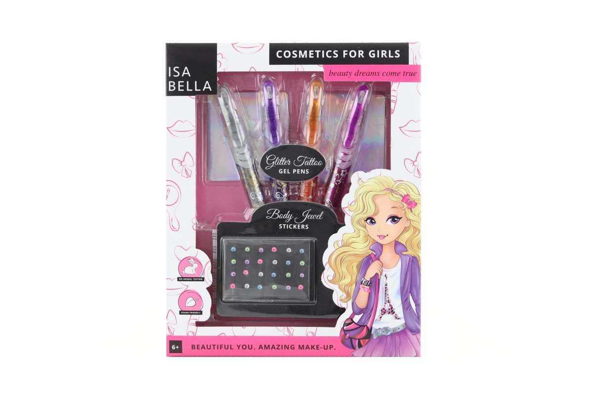 Otkrijte čaroliju sjaja s ovim zabavnim tetovažnim setom za djevojčice. Zahvaljujući četirima sjajnim perima i korisnim dodacima, vaše će dijete izraditi originalne privremene tetovaže za svaku prigodu – od kućne zabave do dječjih rođendana.