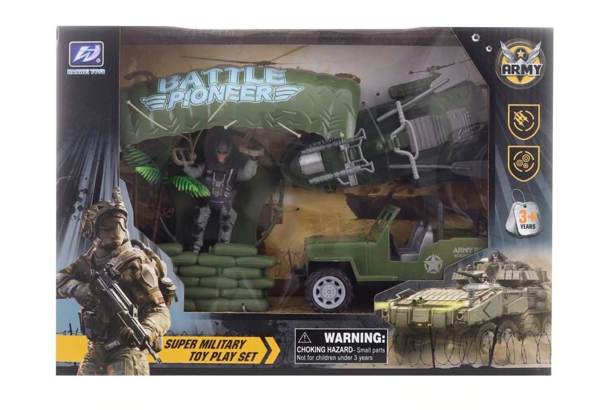 Zabavni vojni set za male avanturiste donosi padobranca s funkcionalnim padobranom, džip, vodeni skuter i dodatne pribore za akcijske misije. Izrađeno od izdržljive plastike, prikladno od 3 godine.