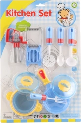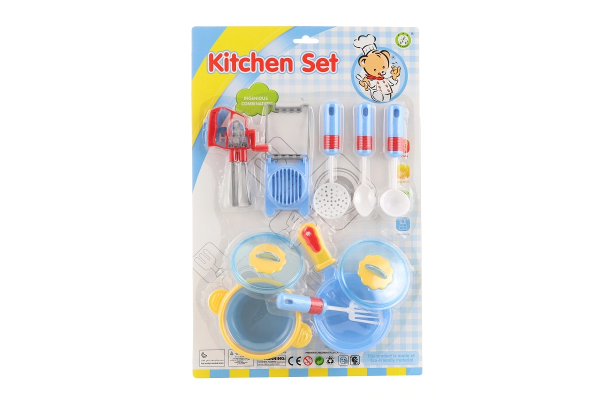 Igraći set za dječju kuhinju za male kuhare sadrži sve potrebno za igru kuhanja. U njemu ćete pronaći lonac s poklopcem, tavu s poklopcem, lopaticu, kutljače, režač za jaja i ručnu pjenjaču. Pakirano na blistru, idealno kao poklon. Prikladno od 3 godine.