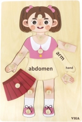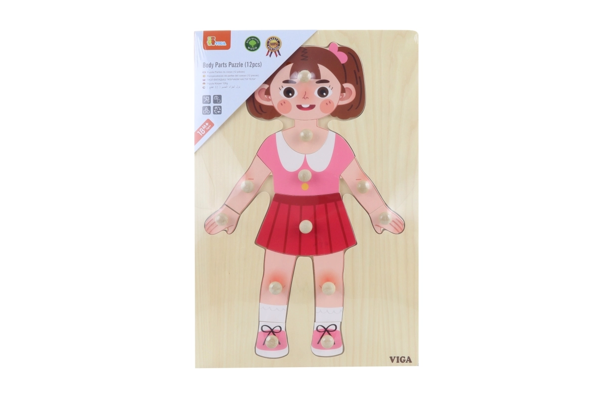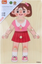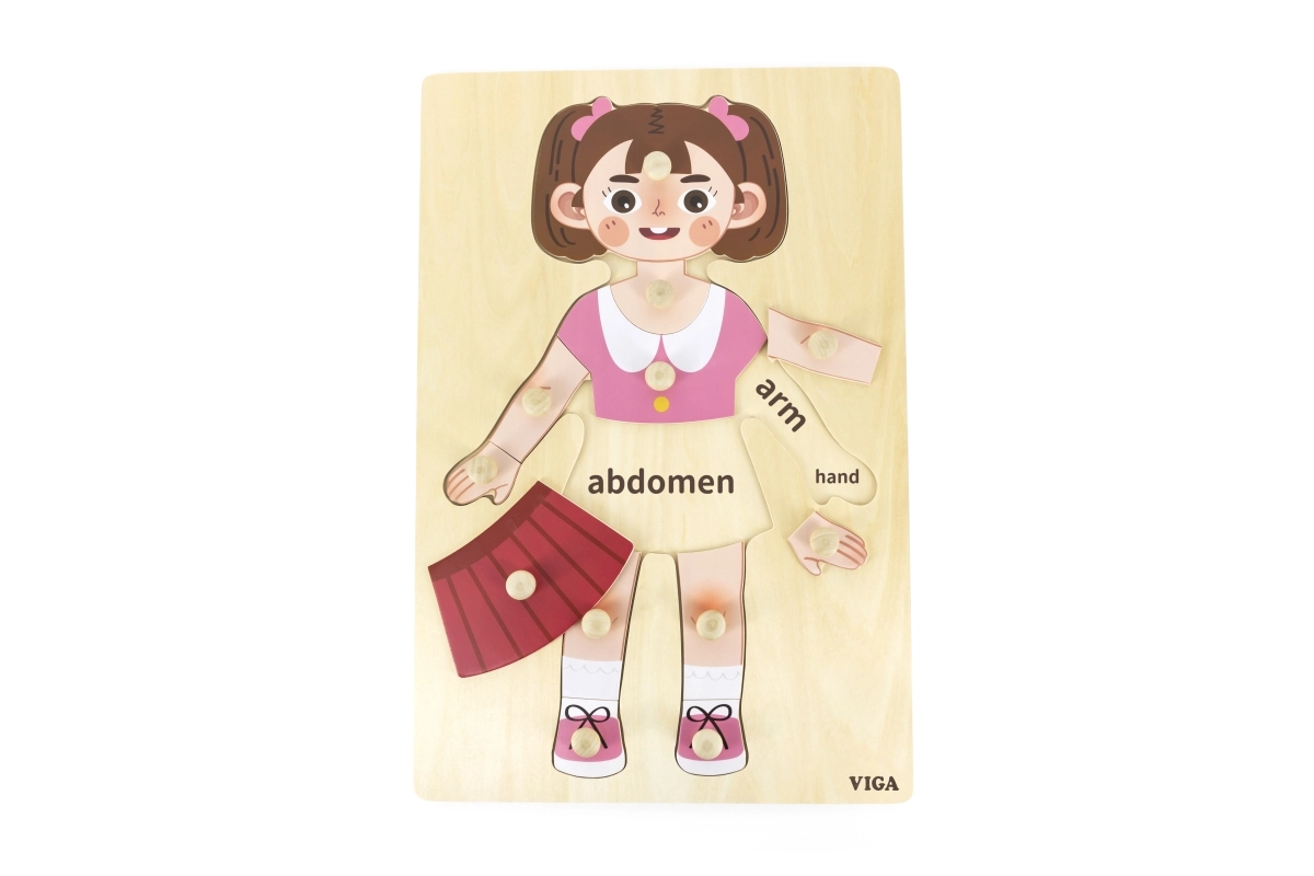 Ova drvena slagalica – djevojčica izvrsno je pomagalo za prvo upoznavanje ljudskog tijela i razvoj koordinacije oko–ruka. Zahvaljujući robusnoj izradi i ugodnom dizajnu djeca će je brzo zavoljeti te kroz igru vježbati finu motoriku, strpljenje i koncentraciju.