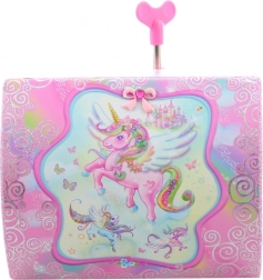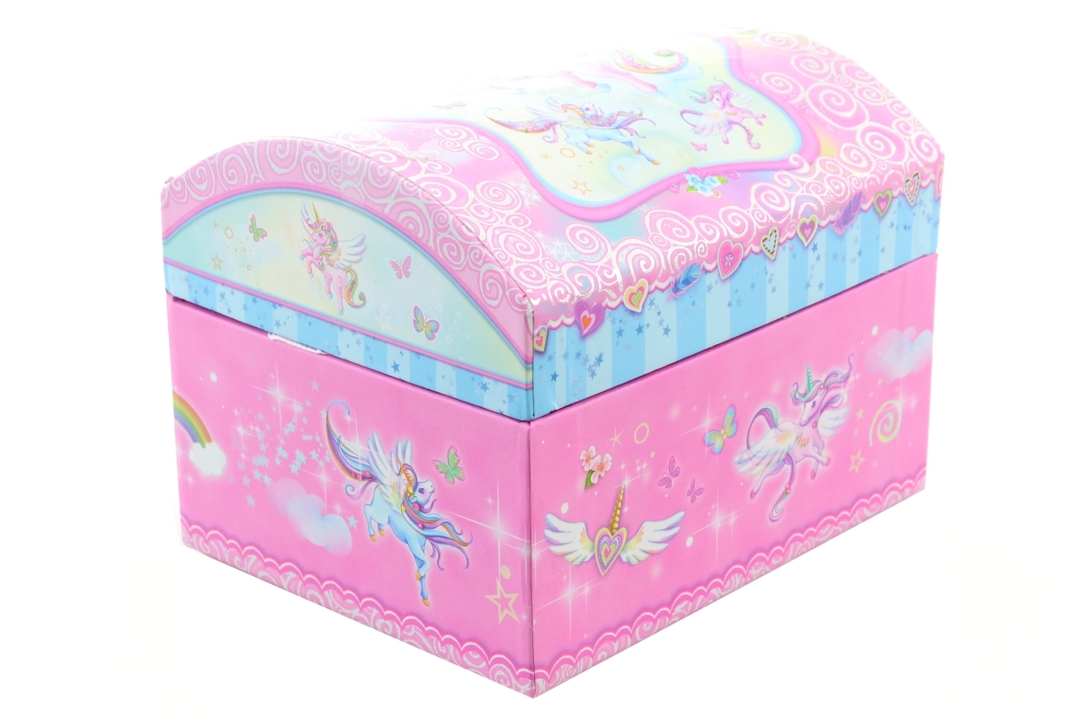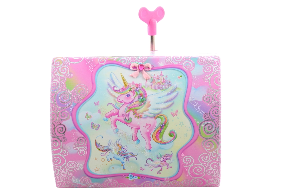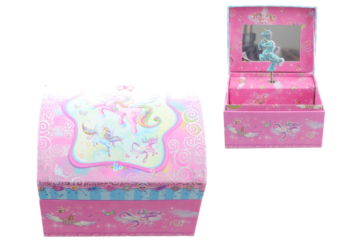 Čarobna ružičasta kutijica za nakit s motivom jednoroga razveselit će svaku malu damu. Nakon navijanja mehanizma figurica balerine se zavrti i zazvuči nježna melodija. Unutra se nalazi zrcalce i prostor za sitna blaga. Idealno kao dar i prekrasna dekoracija dječje sobe. Glazbeni mehanizam, rotirajuća balerina, unutarnje zrcalce, sladak motiv jednoroga.