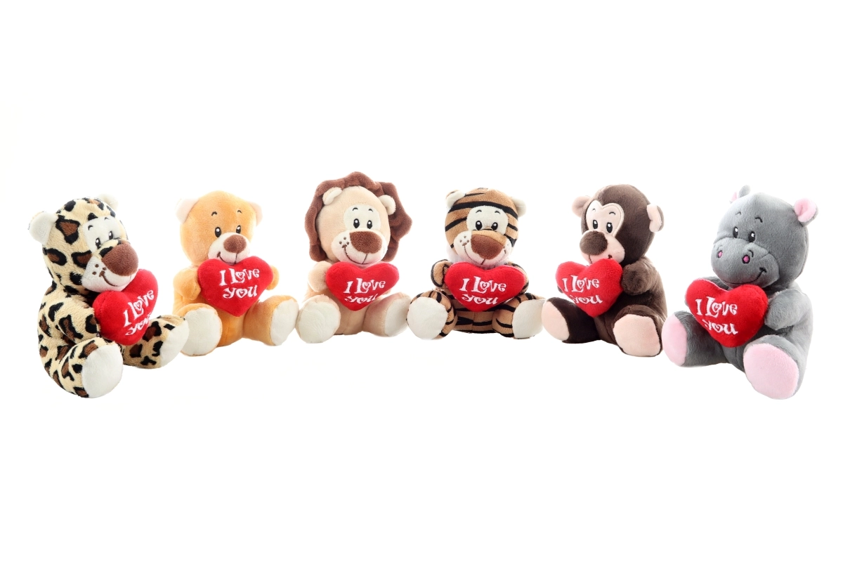 Preslatka plišana životinjica s crvenim srčekom „I Love You“ razveselit će i djecu i odrasle. Možete birati između više vrsta – tigar, lav, leopard, medo, majmunčić i mali nilski konj. Igračka je mekana, nježna na dodir i idealna kao dar iz ljubavi, mazilica za spavanje i dekoracija za dječju sobu. Prikladno od 0+.