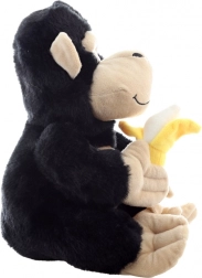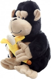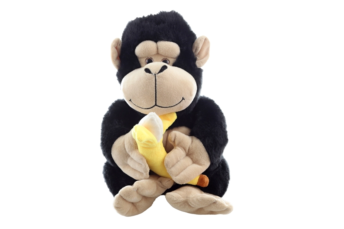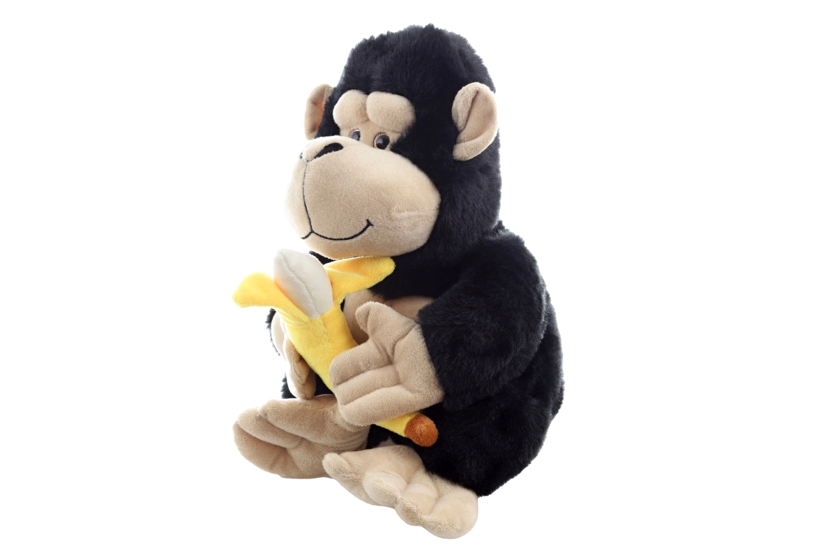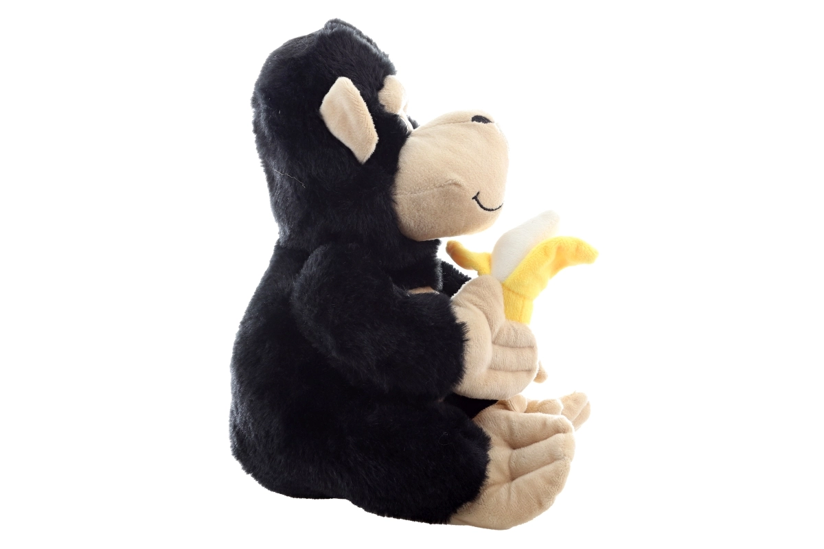 Ova plišana gorila visine 28 cm osvaja na prvi pogled svojim mekim crnim krznom i kontrastnim bež licem, šapama i stopalima. U šapama ponosno drži mekani žuti banan – simpatičan dodatak koji poziva na imaginativnu igru i pričanje priča.