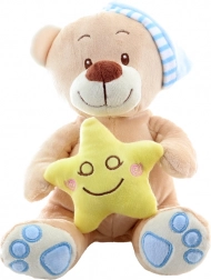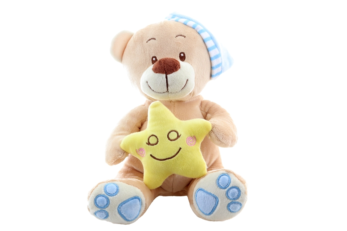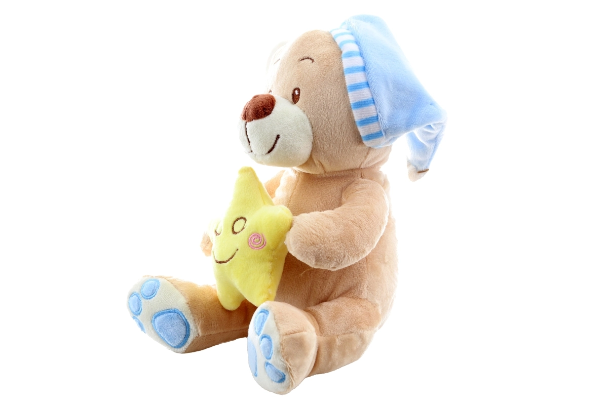 Ovaj nježni plišani medo s plavom kapicom donosi djeci osjećaj mira i sigurnosti. Žuta zvjezdica u šapicama podržava umirujuće rituale prije spavanja, dok mekani materijali jednostavno pozivaju na maženje. Zahvaljujući vezenim očima i osmijehu, igračka je prikladna i za one najmlađe.
