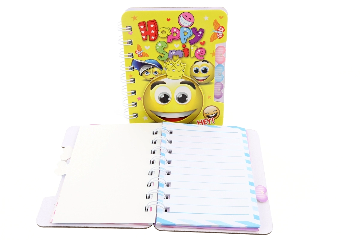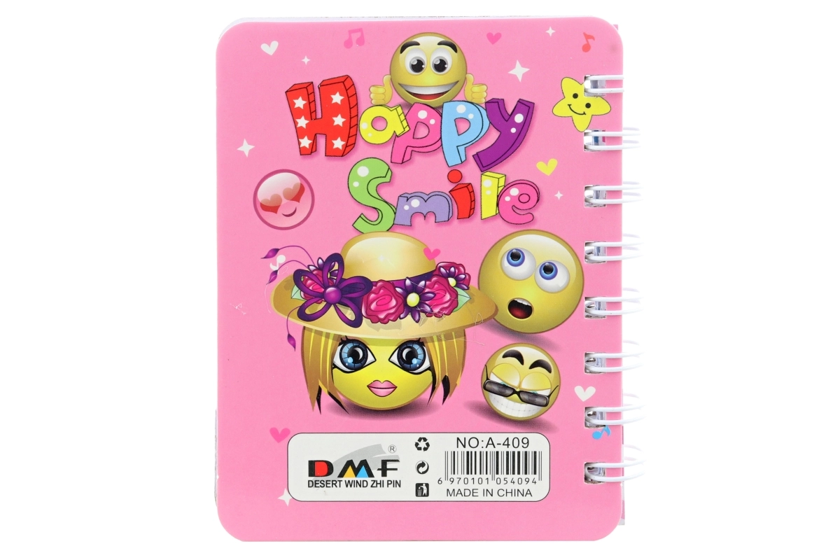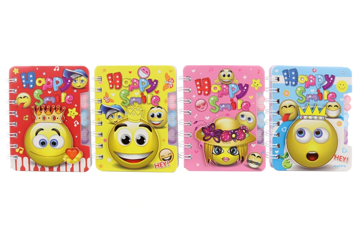Korice s natpisom “Happy Smile” dolaze u nekoliko veselih dizajna. Bilježnica je pakirana u vrećicu i pogodna je za bilješke, popise, dnevnik ili brze skice. Proizvod nije igračka.
