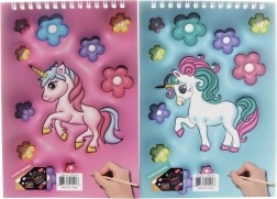 Otkrijte zabavan način crtanja s grebalica bilježnicom s motivom jednoroga. Dovoljno je nježno sastrugati crni sloj i ispod će se pojaviti žive boje koje će svaki potez pretvoriti u čarobnu sliku. Zahvaljujući spiralnom uvezu, stranice se lako okreću, a bilježnica dobro drži oblik.