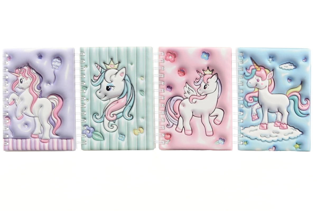 Preslatka bilježnica s motivom jednoroga razveselit će djecu i odrasle. Ima spiralni uvez za udobno okretanje listova, 80 liniranih stranica u 2 boje i podstavljene, 3D oblikovane korice s efektnim reljefom. Kompaktna dimenzija 17,6 × 12,5 cm stane u torbicu i ruksak.