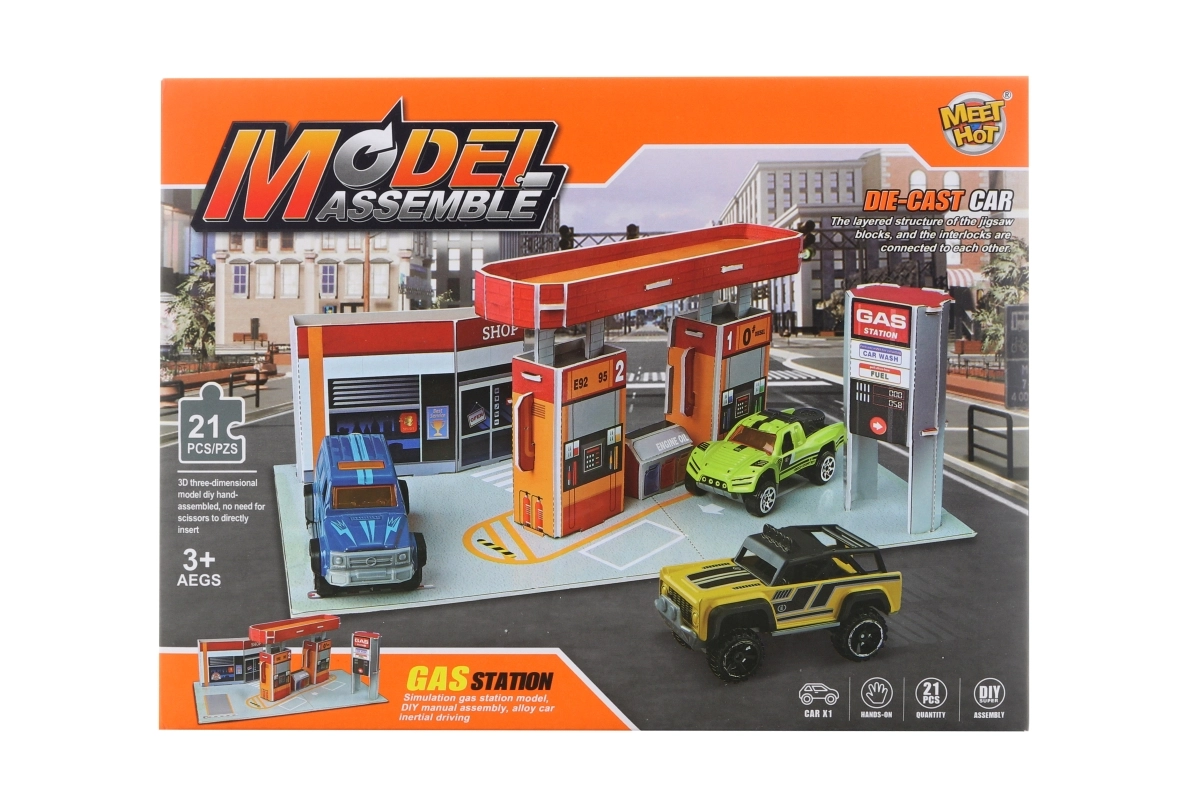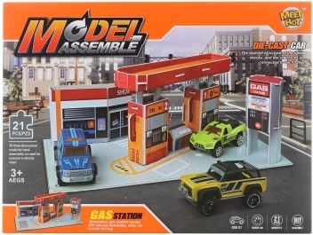 Zabavan konstrukcijski set za male zaljubljenike u aute sadrži sve potrebno za sastavljanje vlastite benzinske postaje i jedno metalno autić. Dijelovi su od meke kartonske mase, lako se sklapaju i stvaraju realističan prostor za igru. Sastavljena benzinska postaja ima dimenzije 23,5 × 13 × 9,3 cm i idealna je za djecu od 3 godine.