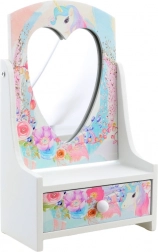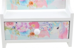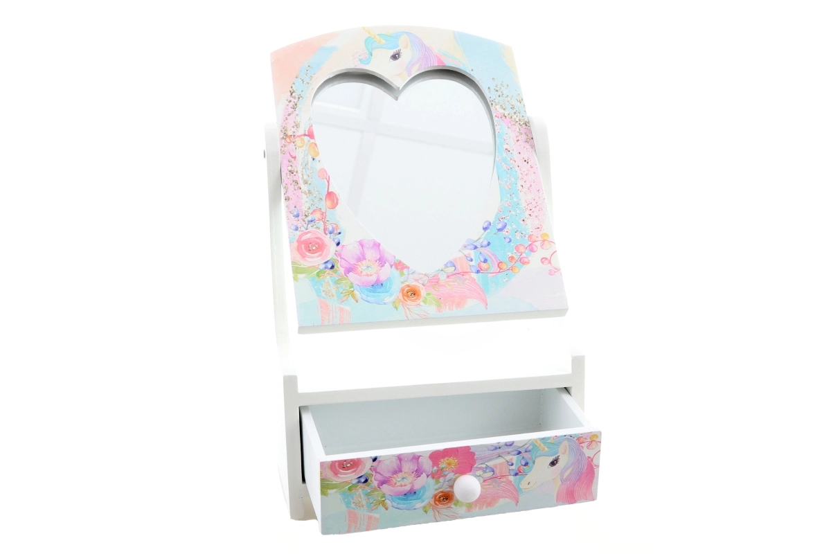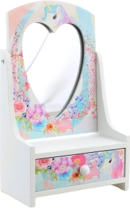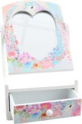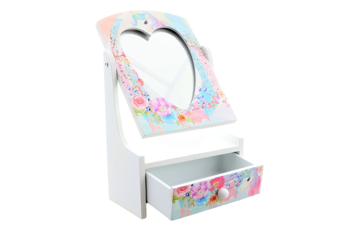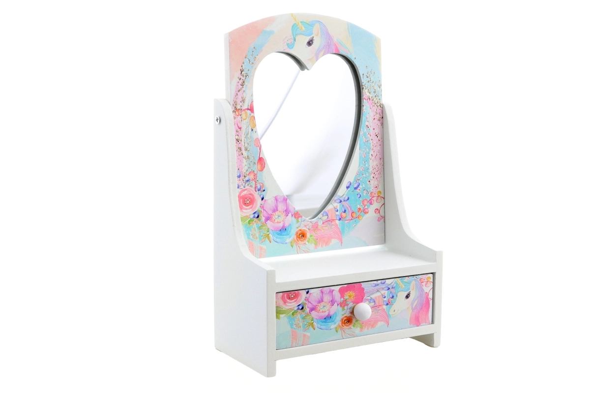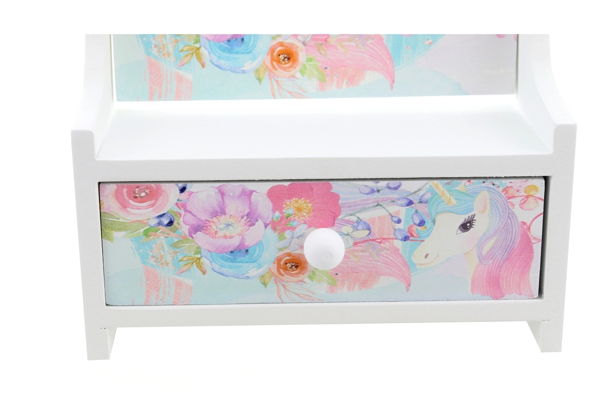 Preslatka drvena kutija za nakit s nagibnim zrcalom u obliku srca pomaže djeci da svoje dragocjenosti imaju pregledno na jednom mjestu. Nježni pastelni cvjetni i jednorog motivi čine je prekrasnom dekoracijom dječje sobe i praktičnim pomagačem za svakodnevno uređivanje i igru.