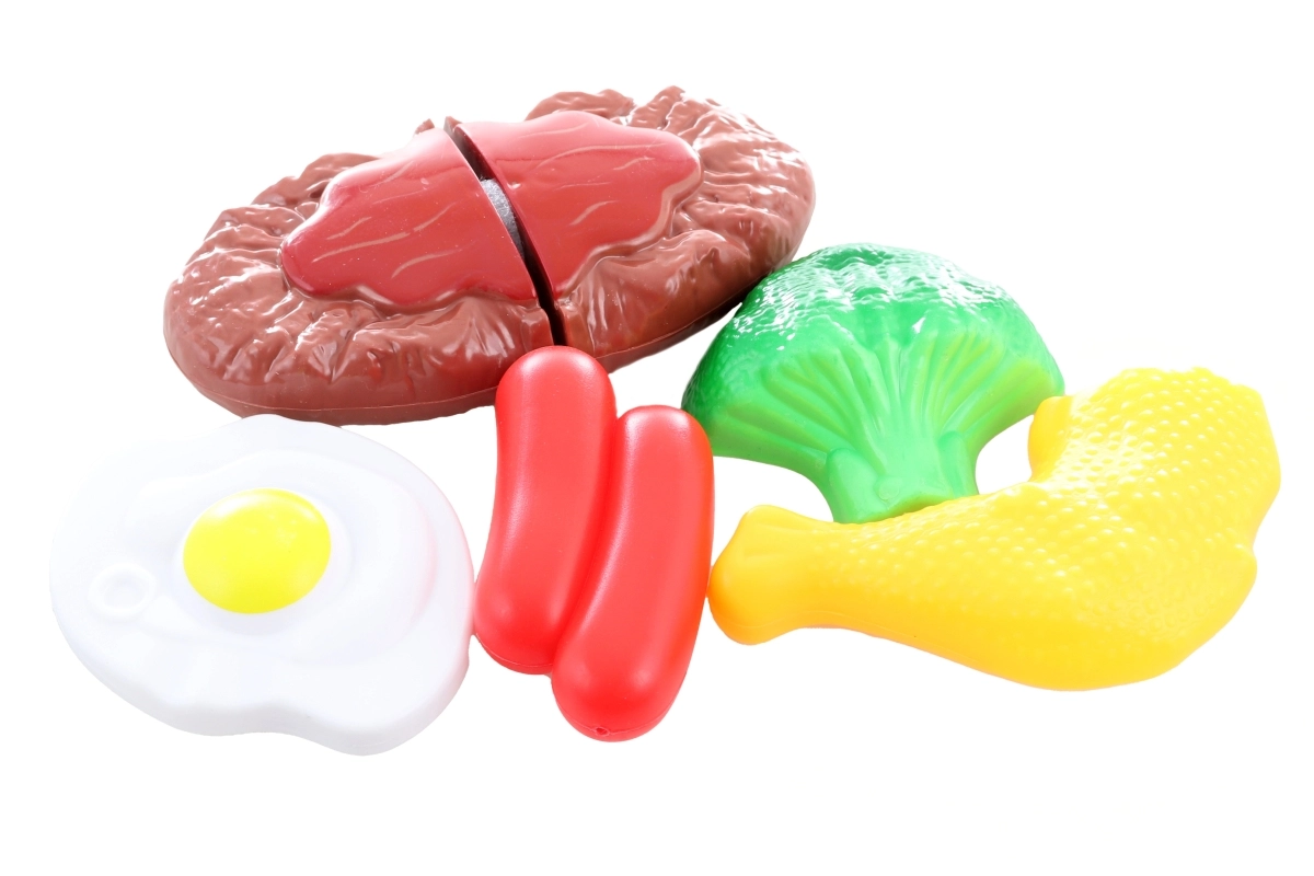 Jaje, odrezak, hrenovke, pileća batkica, riba i povrće u živim bojama potiču maštu i uče djecu prepoznavati vrste namirnica.