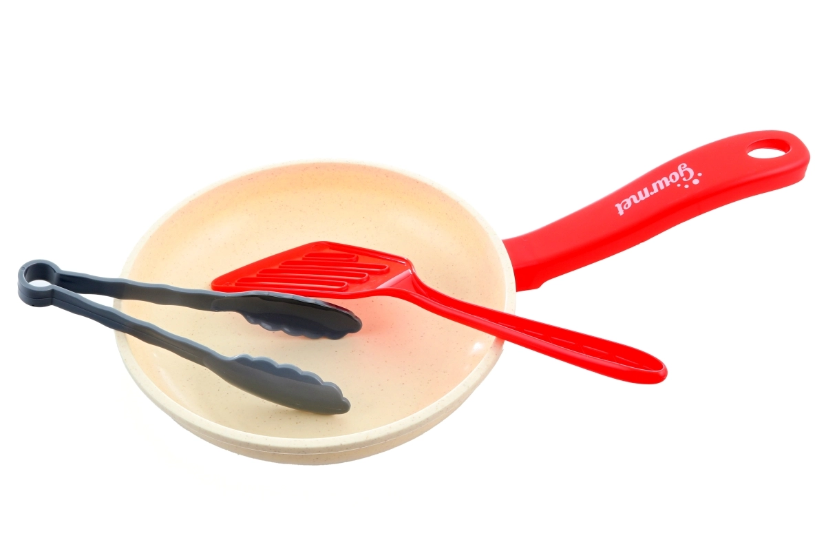 Tava s crvenom drškom, lopatica s prorezima i kliješta od izdržljive plastike dizajnirani su tako da se lako drže i sigurno koriste.