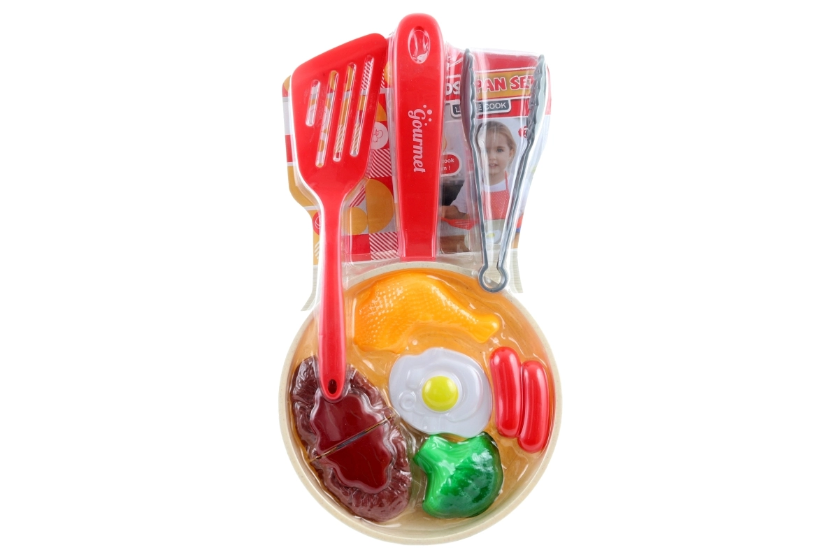 U pakiranju ćete pronaći sve potrebno: tavu, lopaticu, kliješta i 5 komada namirnica (npr. jaje, odrezak, hrenovka, riba ili povrće). Set je izrađen od kvalitetne plastike i prikladan je za djecu od 3 godine naviše.