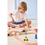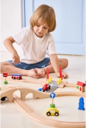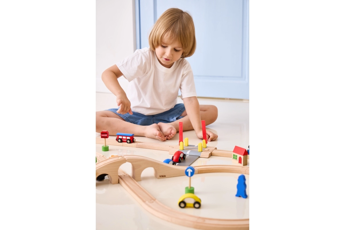 Masivna drvena konstrukcija i čvrsti dijelovi podnose svakodnevnu igru. Idealan dodatak setovima s vlakićima, autićima i prometnim znakovima.