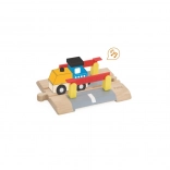 Obje crvene rampe lako se podižu i spuštaju – djeca vježbaju finu motoriku i uče zaustaviti auta i vlakić u sigurnom trenutku.
