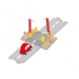 Robusna drvena konstrukcija osigurava dug vijek trajanja i sigurnu igru. Kompatibilni završeci omogućuju lako povezivanje s uobičajenim drvenim sustavima tračnica i cesta. Napajanje na 2 gumbaste baterije daje prijelazu atraktivne efekte koji potiču maštu i koncentraciju.
