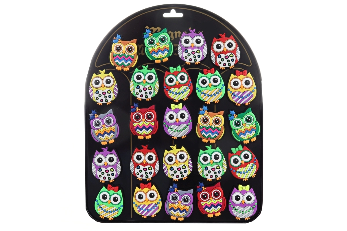 Preslatki magneti s motivom sovičica uljepšat će hladnjak, ploču i oglasnu ploču. Pakiranje sadrži 24 komada i magnetnu ploču za pregledno pohranjivanje. Magneti su od meke plastike, dimenzija oko 4,5 × 3,5 cm i namijenjeni su dekorativnoj uporabi.