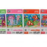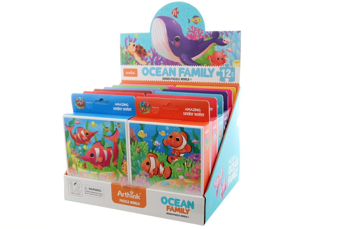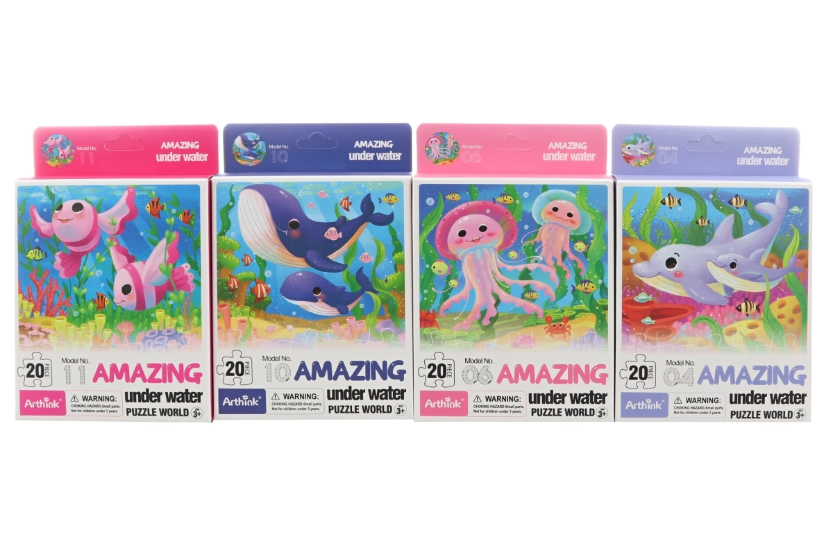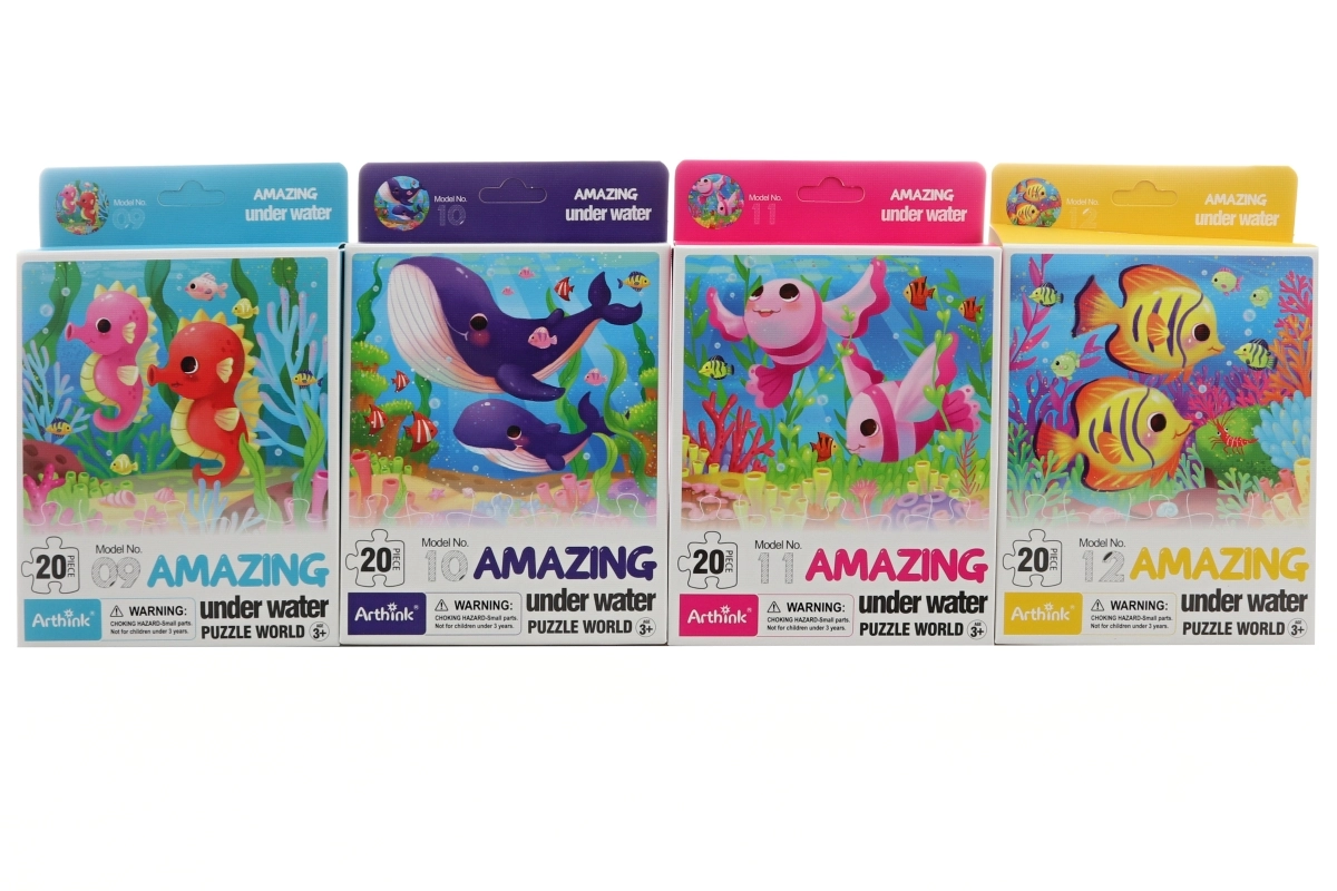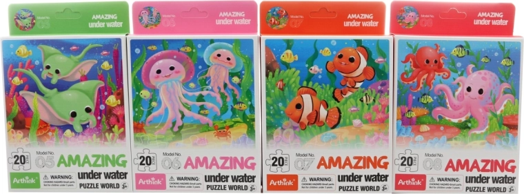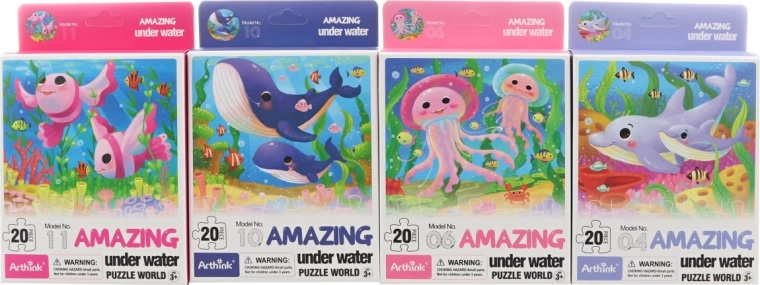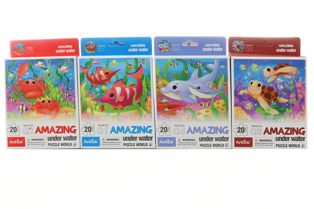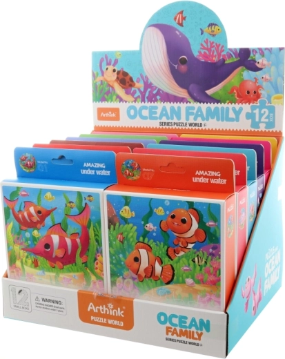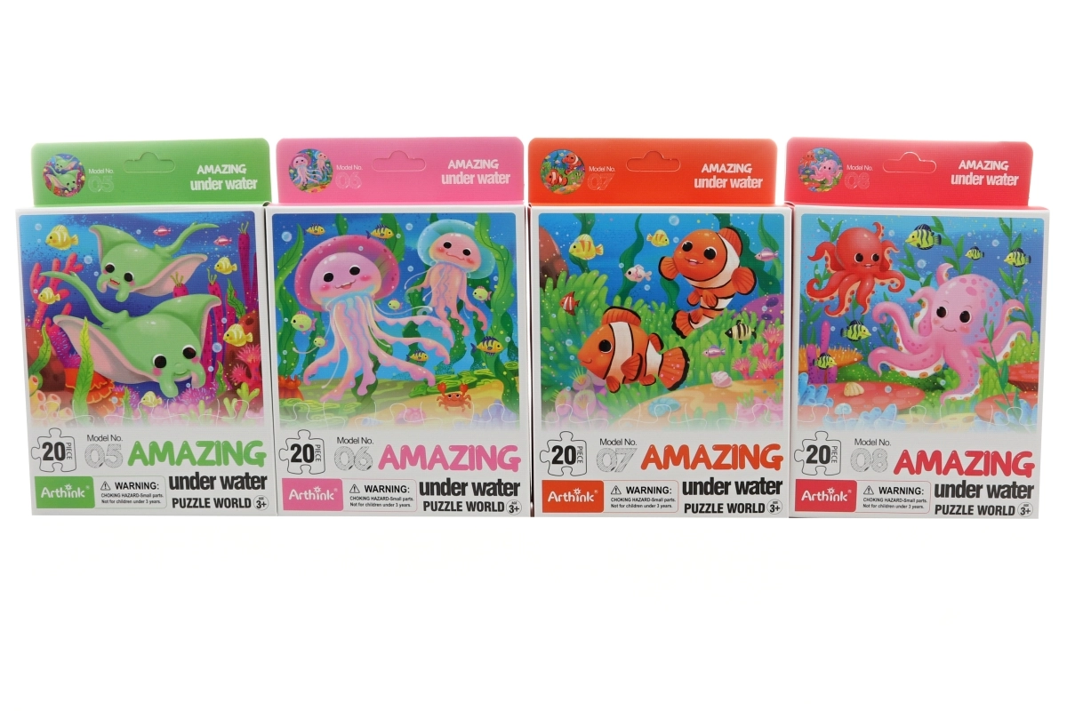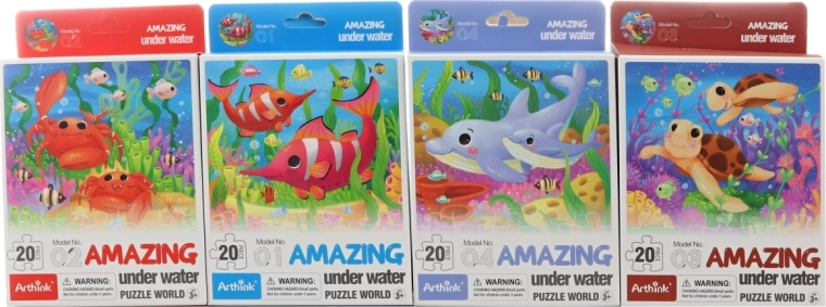 Nakon slaganja puzzle imaju kompaktne dimenzije 21 × 19 cm, pa se lako spremaju i prenose. Od 12 dostupnih motiva šaljemo varijantu prema trenutnoj raspoloživosti na skladištu, a svaki prikazuje atraktivne scene iz podmorskog života.