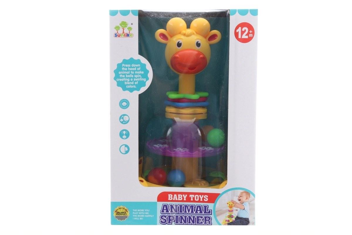 Ova vesela vrteća igračka u obliku žirafe donosi djeci radost pokreta i otkrivanja. Jednostavnim pritiskom na glavu žirafe zavrte se unutarnji dijelovi s kuglicama, što stvara privlačan vizualni efekt i motivira djecu na ponovljenu igru. Zvrk je idealan za razvoj fine motorike, koordinacije oko–ruka i prepoznavanja boja.