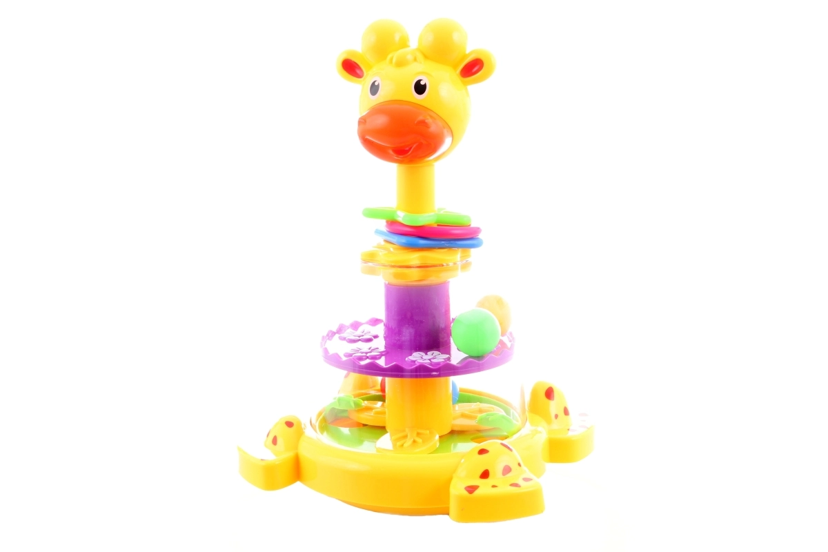 Intuitivan mehanizam: nježnim pritiskom na glavu žirafe zavrte se šarene kuglice i prsteni unutar prozirne komore.
