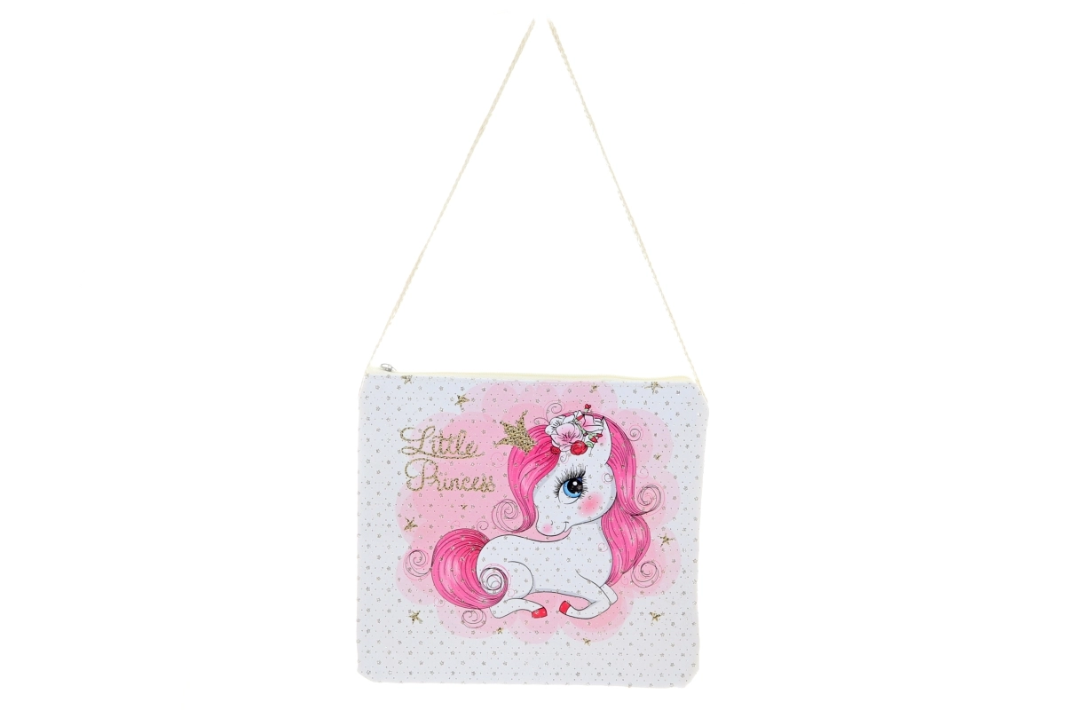 Ova dekorativna torbica s motivom jednoroga ističe se izražajnim sjajnim tiskom na prednjoj strani (eko koža) i ugodnom platnenom izradom. Idealna je kao stilski dodatak uz odjevne kombinacije, za sitnice ili kao poklon za ljubitelje jednoroga.