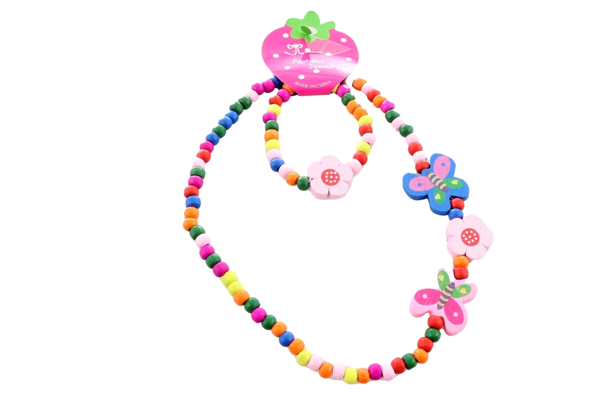 Slatki set dodataka za male modne zaljubljenice s motivom leptirića. Sadrži ogrlicu i narukvicu od drvenih perli nanizanih na elastičnoj gumici za udobno i prilagodljivo nošenje. Sjajan dodatak dječjim outfitima, pakirano u praktičnoj vrećici.