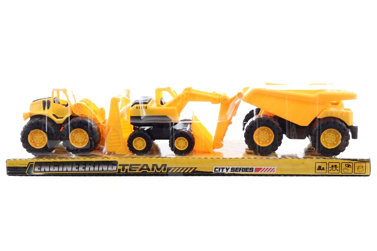 Zabavni set građevinskih strojeva za male graditelje od 3 godine. Vozila imaju kotače slobodnog hoda, izrađena su od izdržljivog plastičnog materijala i odlično leže u dječjoj ruci.