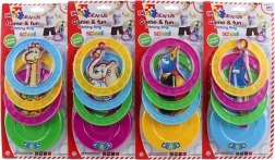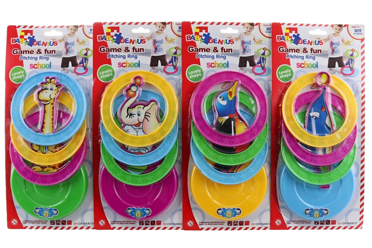 Sadržaj pakiranja uključuje čvrsto postolje i 3 bacačka koluta od kvalitetne plastike. Životinjski motivi daju igri razigran štih i privlače djecu već od 3 godine. Dostupno je više vrsta – odabir ovisi o trenutačnoj raspoloživosti na skladištu.