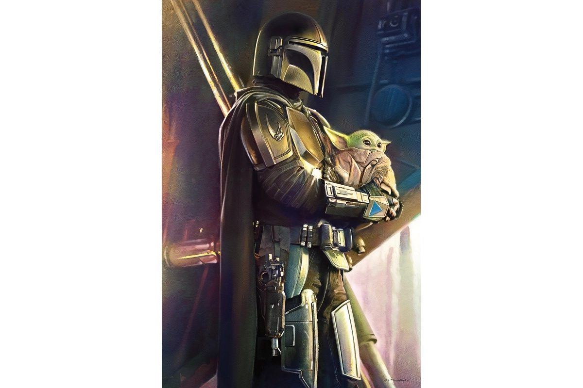 Posebna 3D (lentikularna) obrada daje složenom motivu dubinu i dinamiku – Mandalorian s Groguom ističe se iz svakog kuta.
