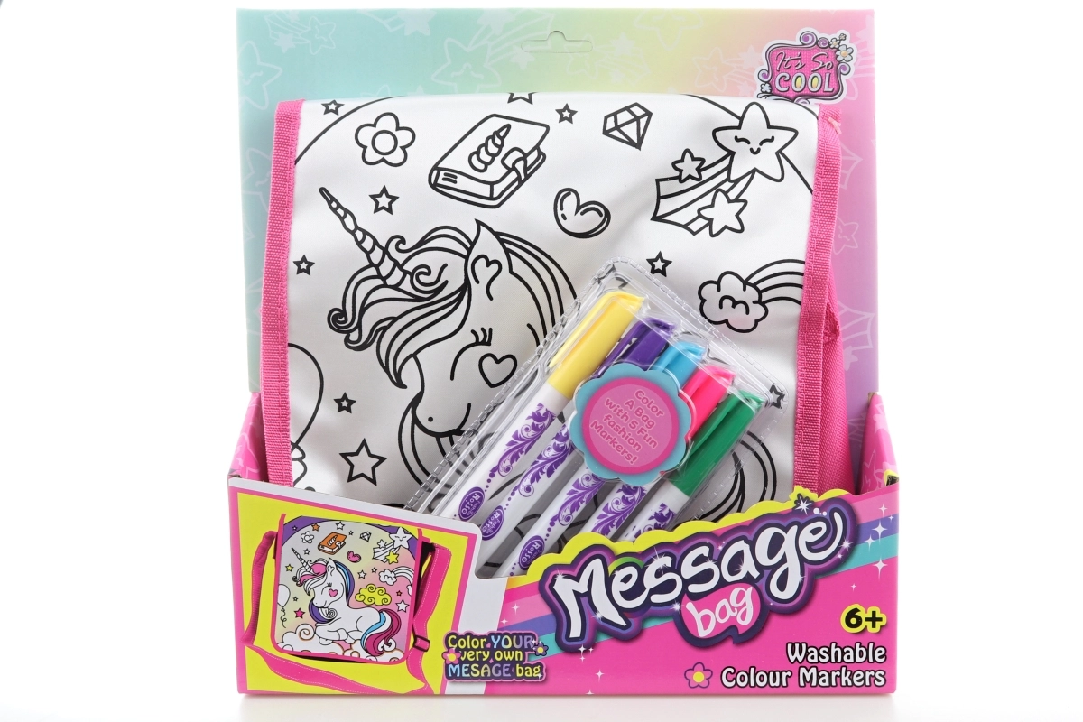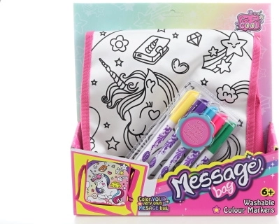Kreativna kabelica za bojanje s preslatkim motivom jednoroga razveselit će svako malo kreativno dijete. U kompletu je podesivi ružičasti remen i set od 5 boja za trenutno bojanje. Kabelica ima praktično zatvaranje na čičak i idealna je za sitnice i za putovanja. Potiče kreativnost, jednostavna za upotrebu i zabava za djecu 3+.