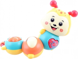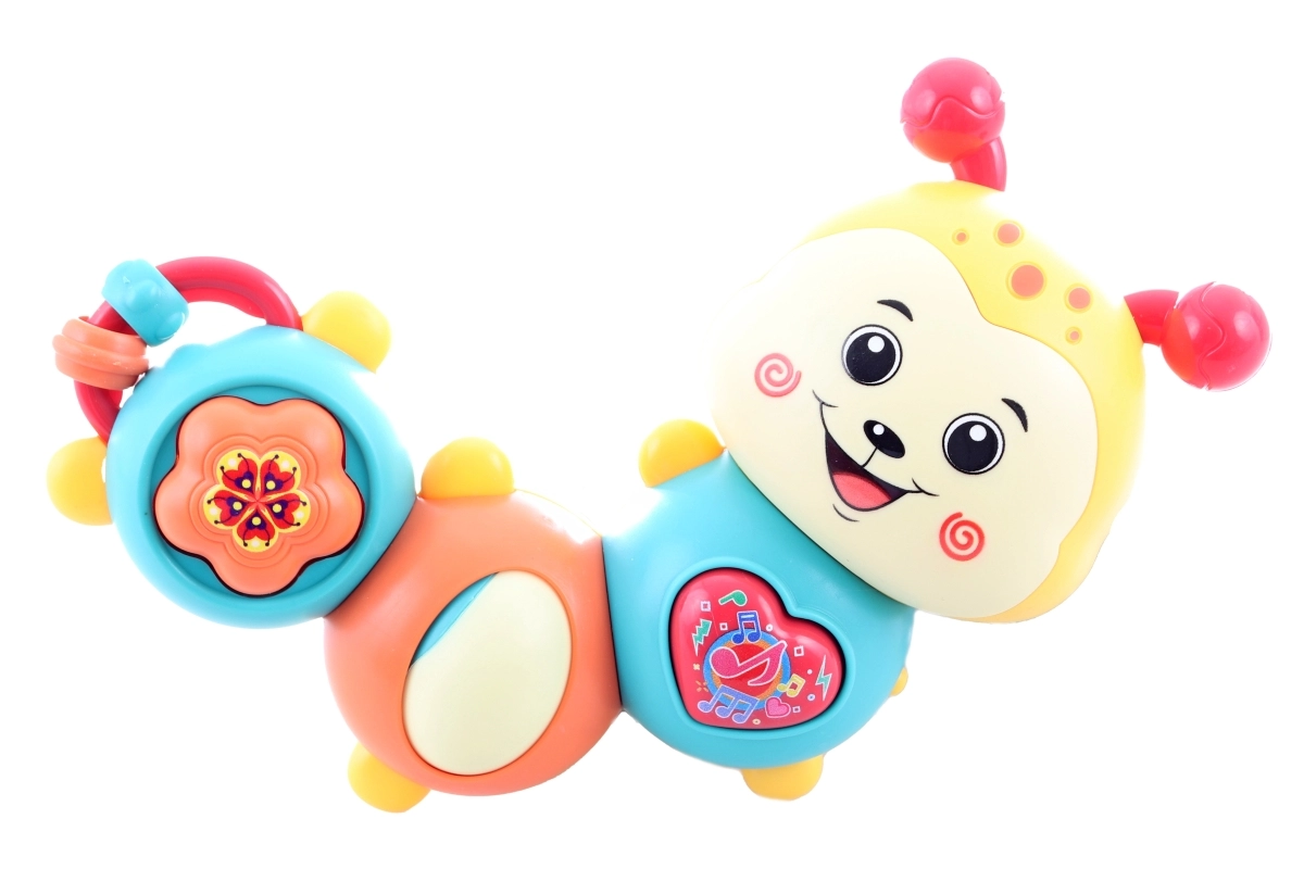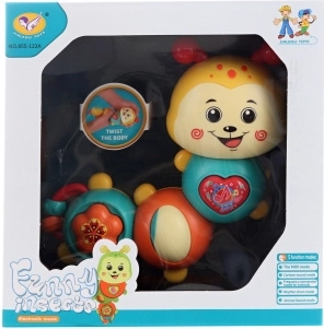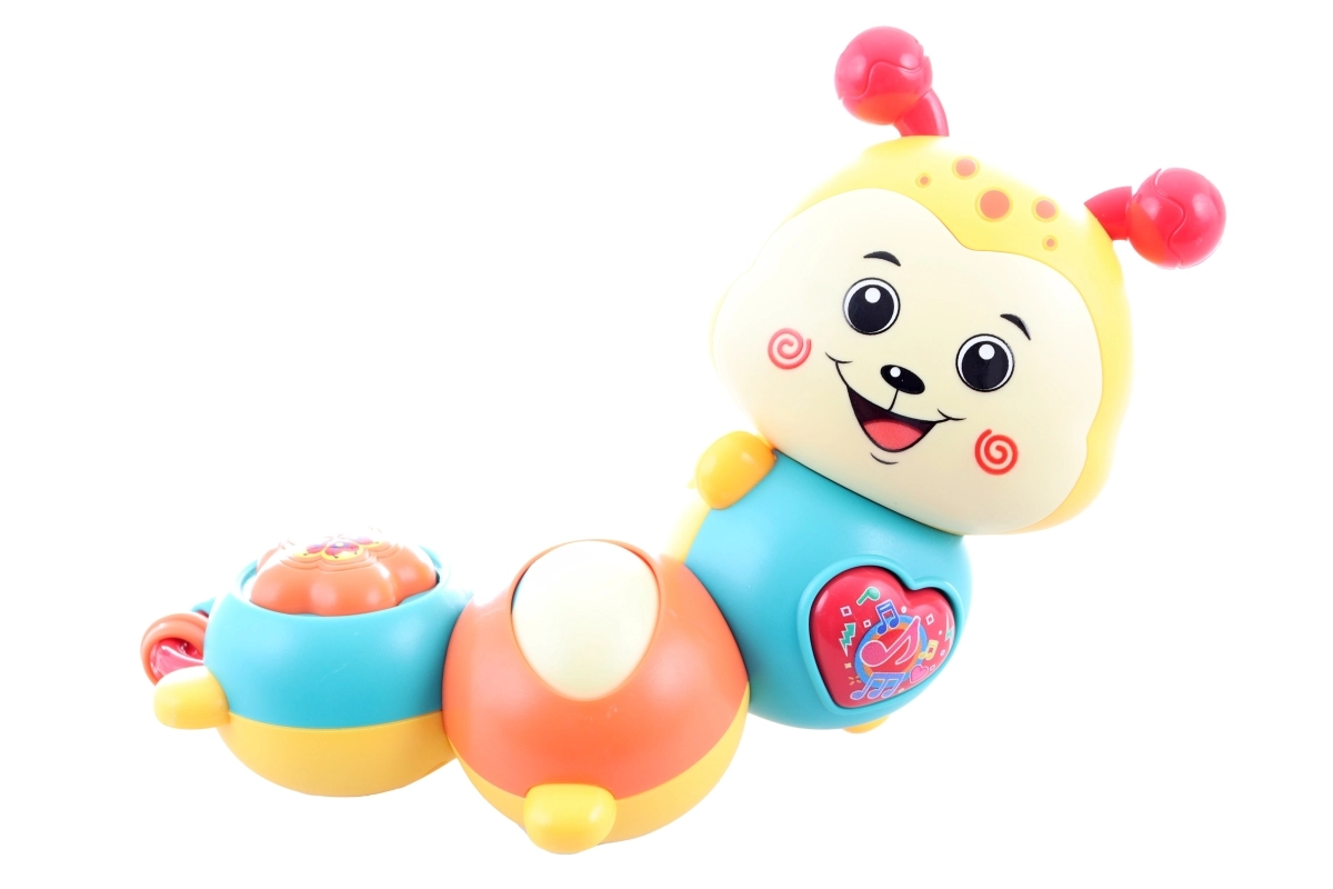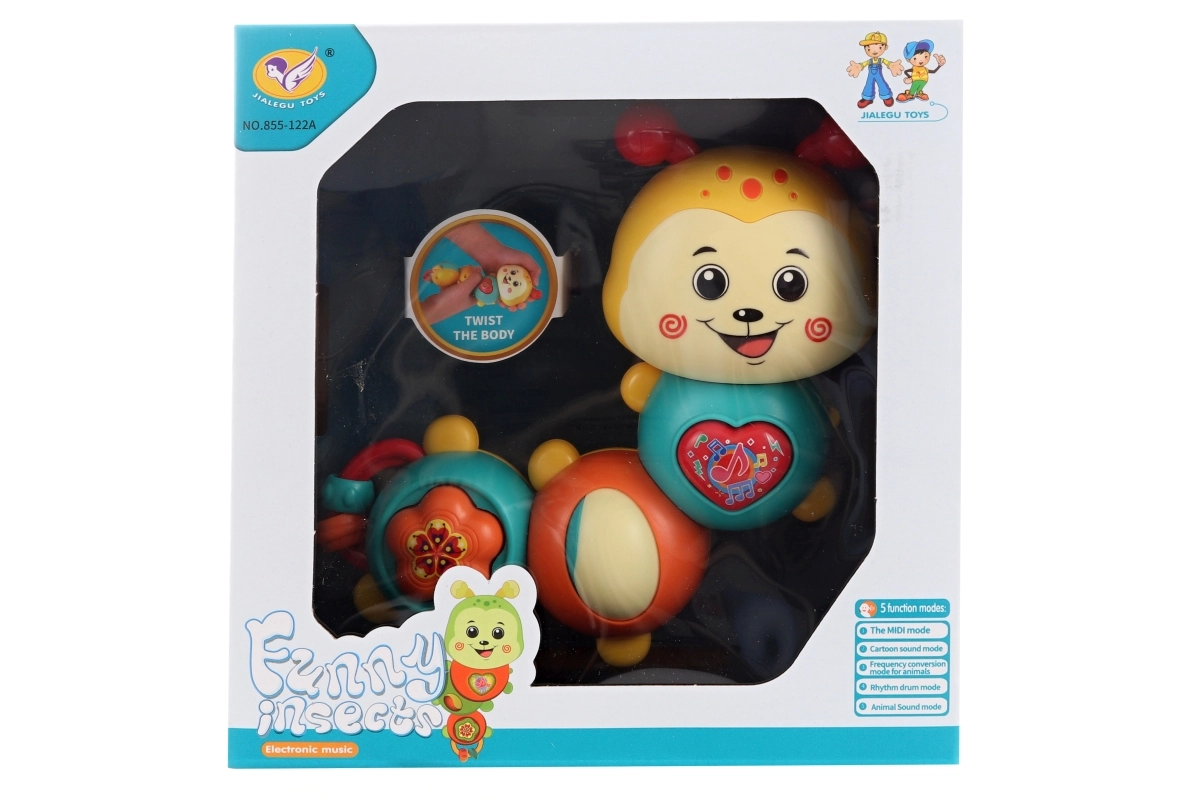 Ova šarena gusjenica privlači djecu veselim izgledom, lakim držanjem i interaktivnim funkcijama. Nakon umetanja baterija reproducira melodije i zvukove koji potiču na istraživanje i vježbaju slušnu percepciju. Okretni dijelovi tijela podupiru finu motoriku i koordinaciju ruku.