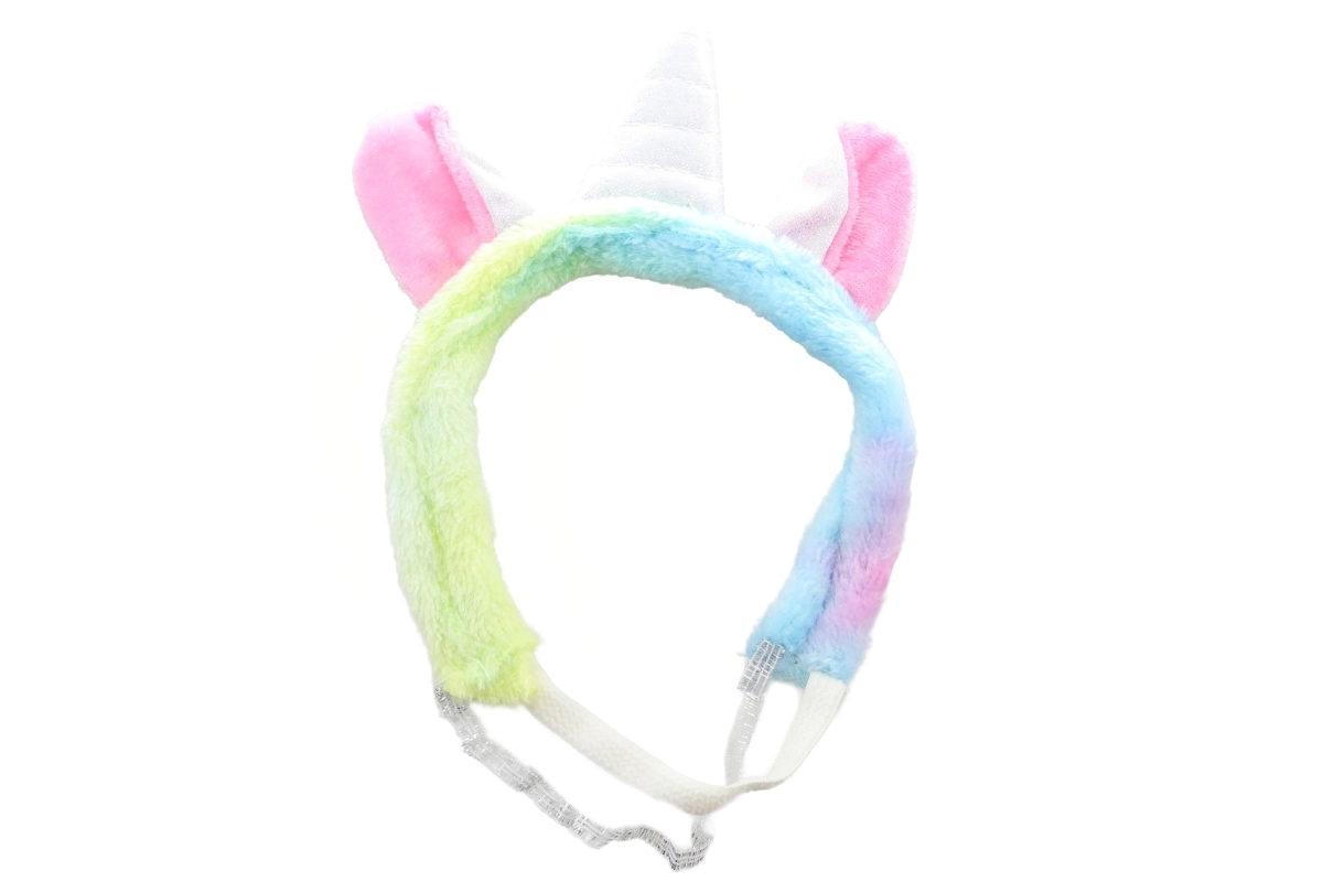 Plišana traka s bijelim rogom i pastelnim pojasom upotpunjuje cijeli outfit i pretvara lutku u malog jednoroga.