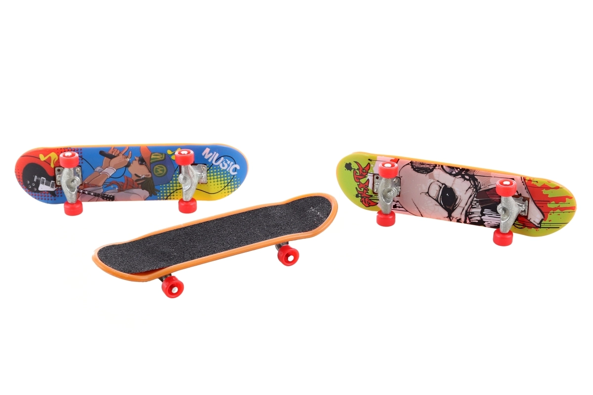 Uživajte u beskrajnoj zabavi s ovom setom od 3 prstna skateboarda za male i velike vozače. Svaki mini skate duljine cca 9,5 cm izrađen je od izdržljive plastike i metala, idealan za učenje trikova na stolu ili rampi. Odlično kao poklon, za kolekcionare i za razvoj fine motorike i kreativnosti.