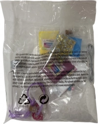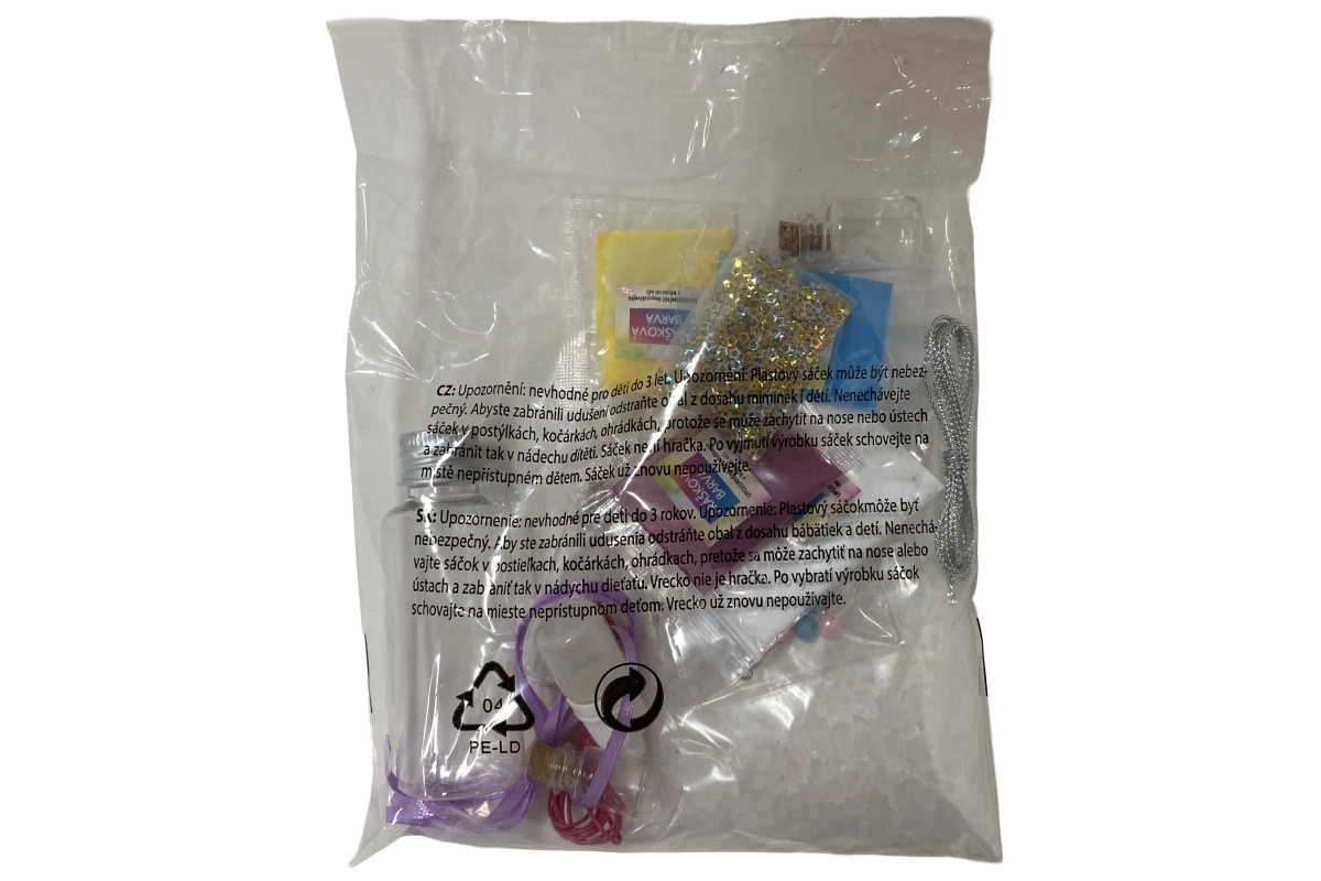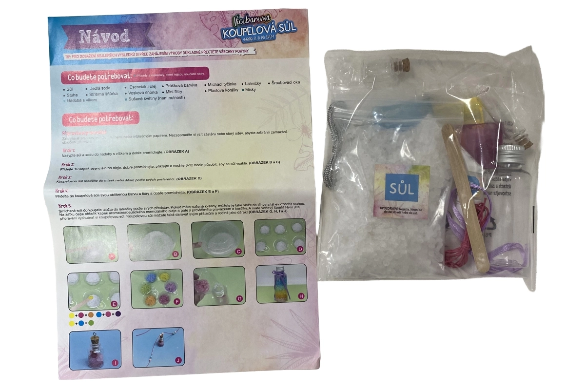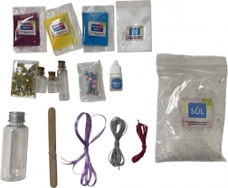 - sol, soda bikarbona, eterično ulje, bočice, obojeni prašci, miješalice, vijčane alkice, srebrna špagica, vrpca, voštana špagica, mini filteri, plastične perlice, upute