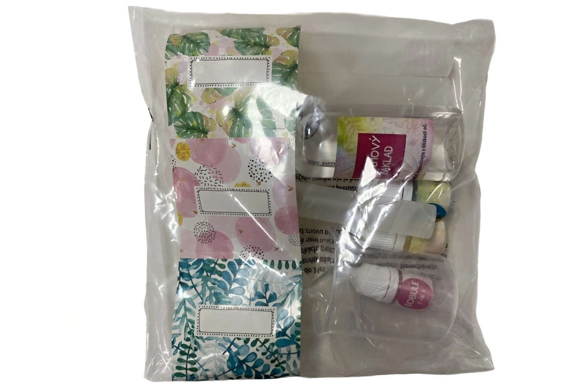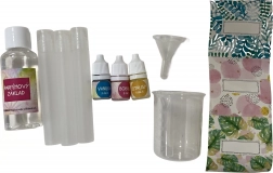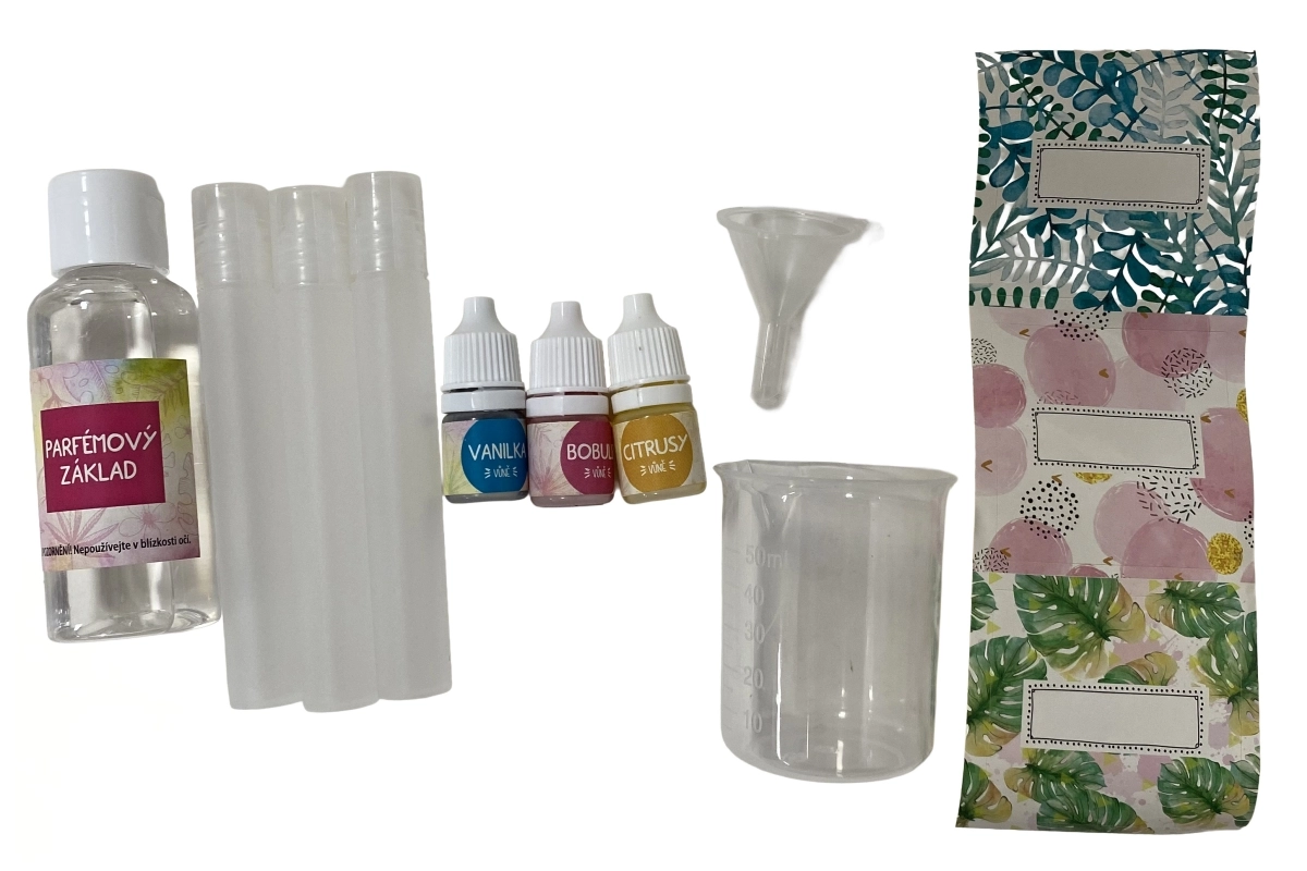 Parfimirana baza, 3 posudice za parfeme, 3 bočice mirisa, lijevak, mjerica, 3 naljepnice, upute