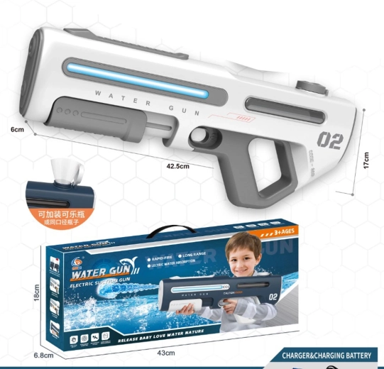 Uživajte u osvježavajućoj ljetnoj zabavi s ovim električnim vodenim pištoljem u bijeloj boji. Nudi osvjetljenje za večernju igru, napajanje baterijom 7,4 V te mogućnost ručne uporabe bez napajanja. Izrađen od kvalitetnih materijala i prikladan za djecu od 3 godine.