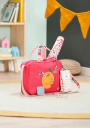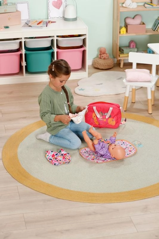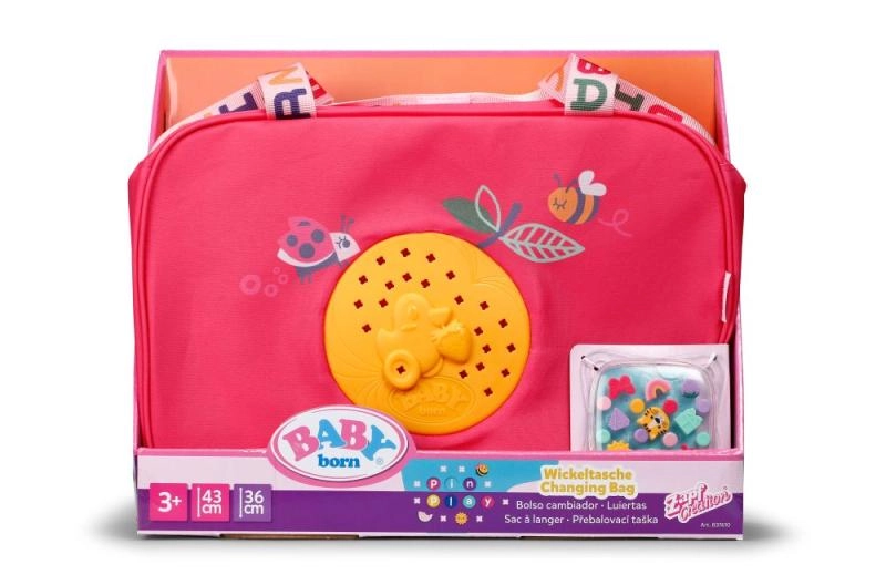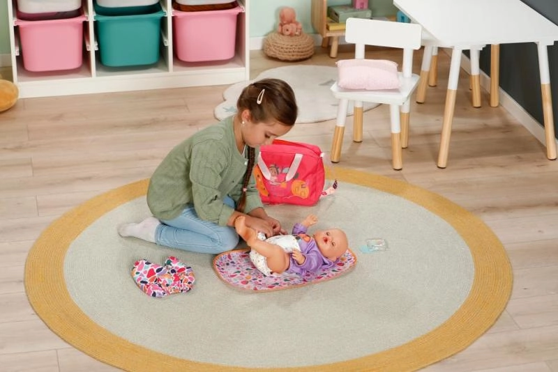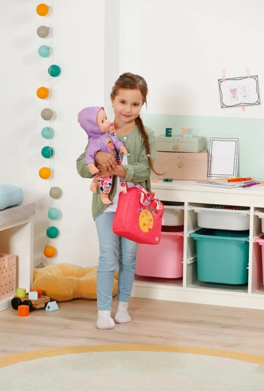 Torba za presvlačenje BABY born lagana je, čvrsta i dizajnirana tako da sve potrepštine za brigu o lutki drži pregledno pri ruci. Torba ima patentni zatvarač, praktične džepove i udoban remen preko ramena. Šareni motivi i razigrani detalji pretvaraju svaku šetnju u stilska pustolovina.