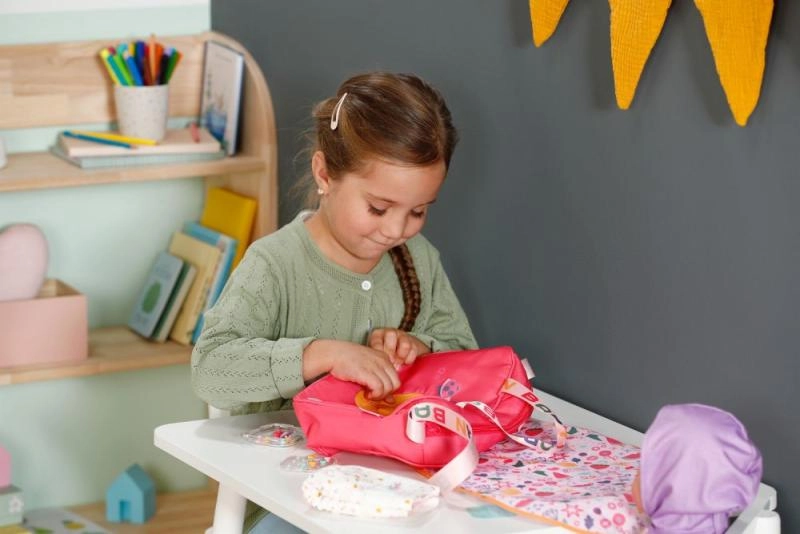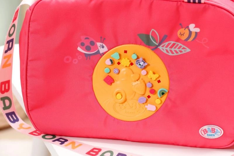 Zahvaljujući ukrasima na kopčanje djeca mogu prilagoditi torbu prema svom raspoloženju – tako potiču kreativnost, finu motoriku i brigu o drugima. Set uključuje sklopivu podlogu za presvlačenje za udobno presvlačenje bilo gdje, pelenu i male dodatke poput kutijice za puder i kutijice za potrepštine.